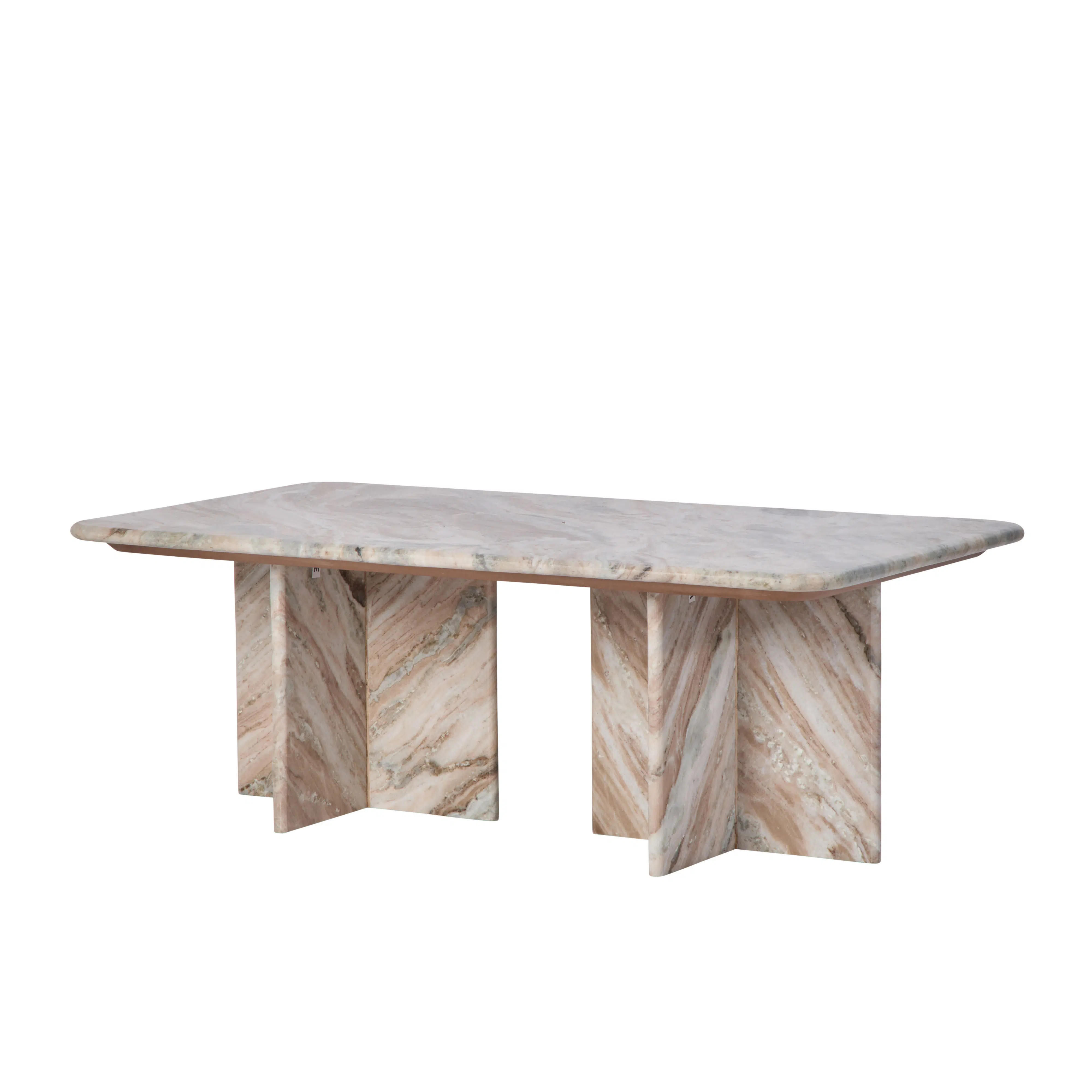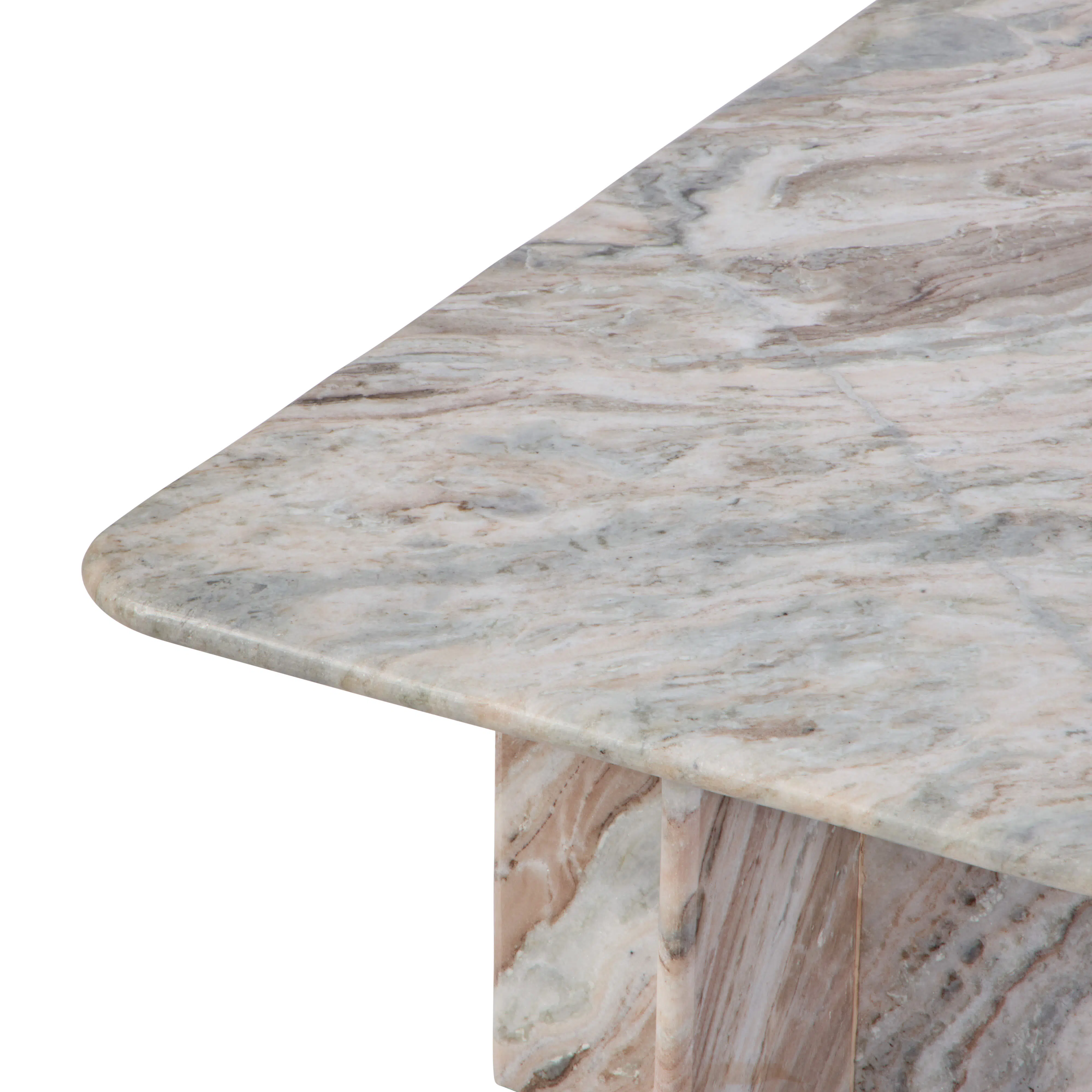 Invite refined minimalism into your living space with this coffee table, featuring an abstract composition of slim, durable sheets of natural Toronto marble. Each piece showcases distinctive veining and subtle variations in tone—ranging through soft pink, warm brown, crisp white, and muted green—ensuring no two tables are exactly alike. The angular silhouette is balanced by thoughtfully rounded corners, softening the look while maintaining a modern, architectural presence.