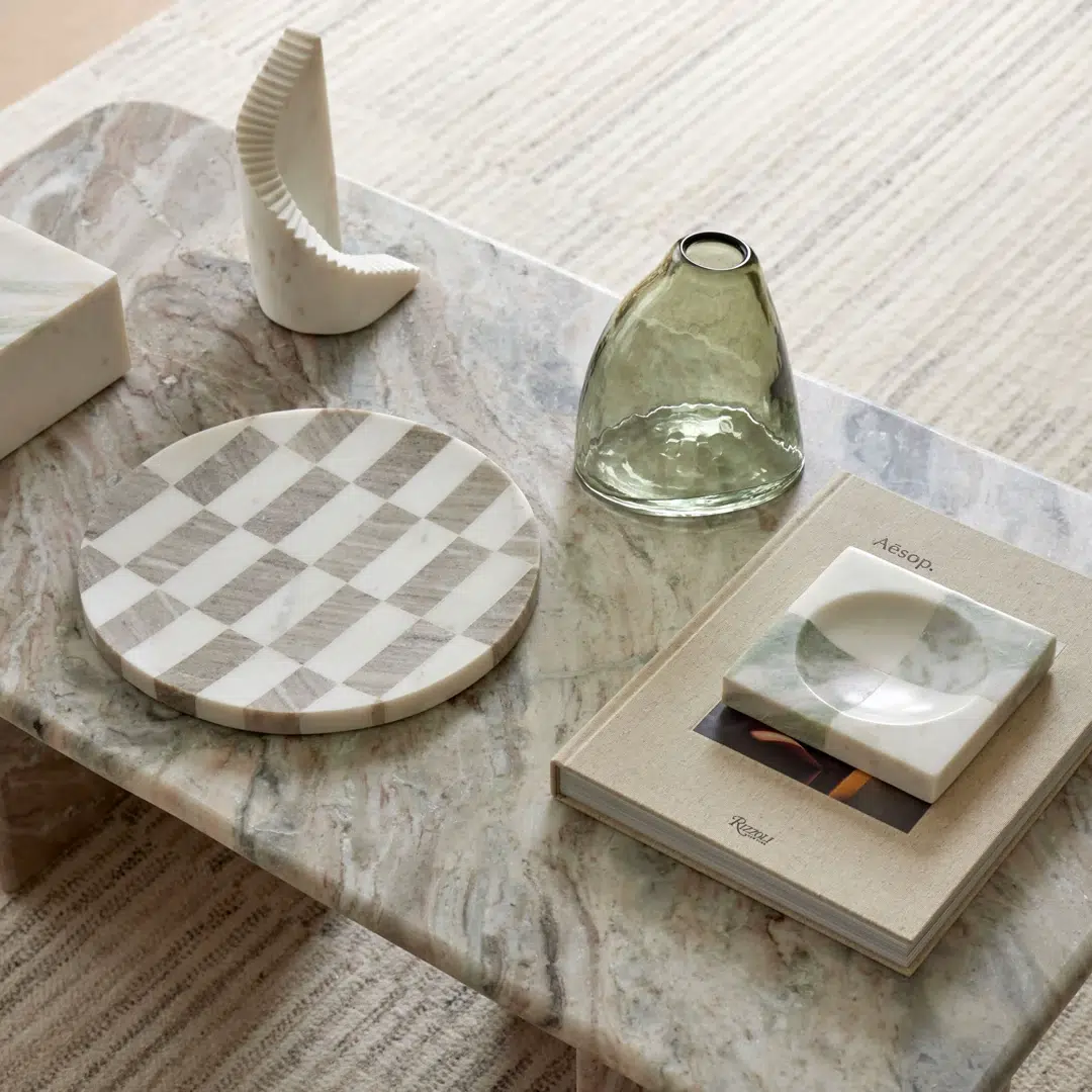 | Features: | Rounded corners, abstract design with slim veined marble sheets |