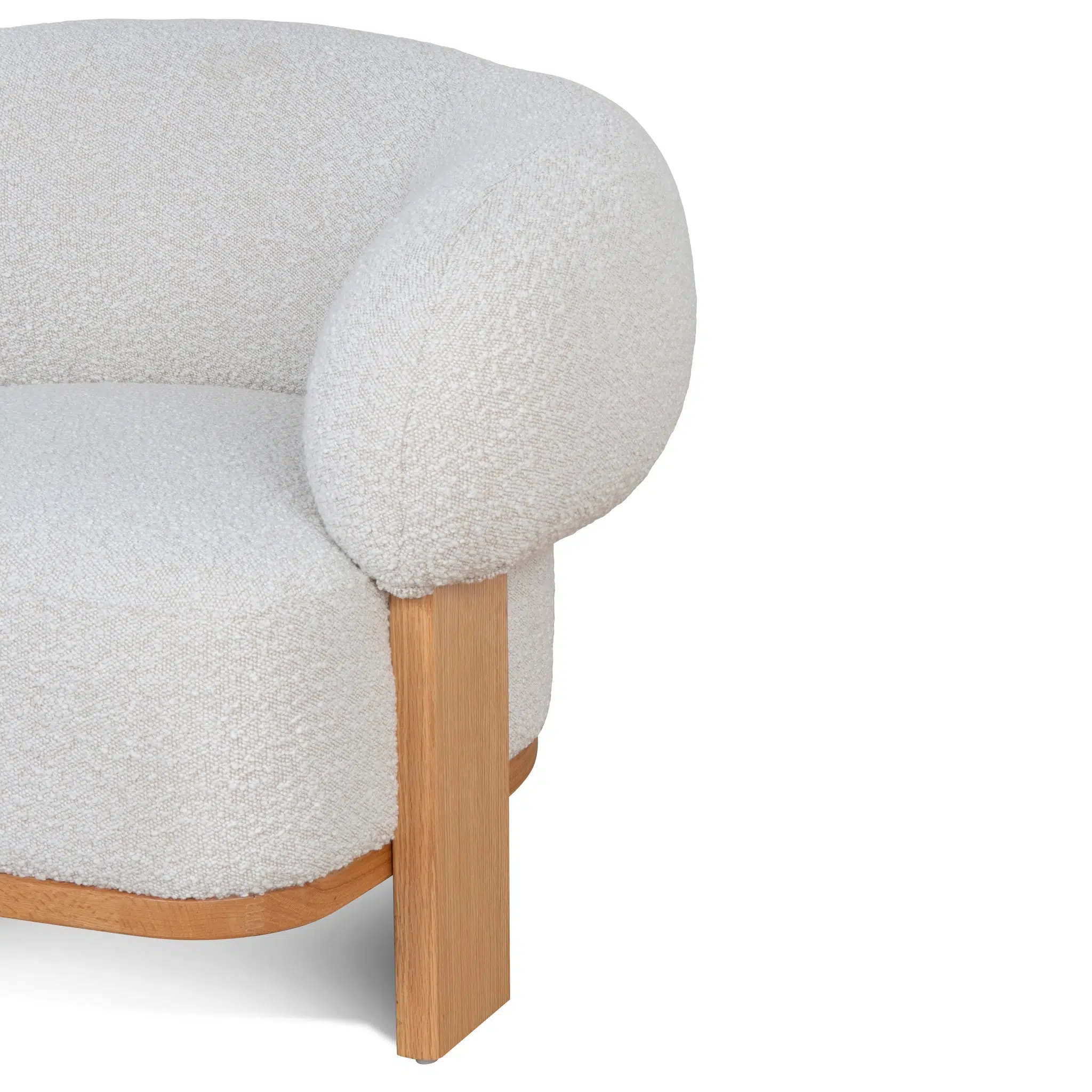 This armchair combines a classic aesthetic with contemporary appeal, featuring a rounded silhouette that blends seamlessly into any modern interior. Its elegant oak wood frame and legs add a touch of natural warmth, while the tactile design ensures it stands out as a statement piece in living rooms, offices, or reading nooks.