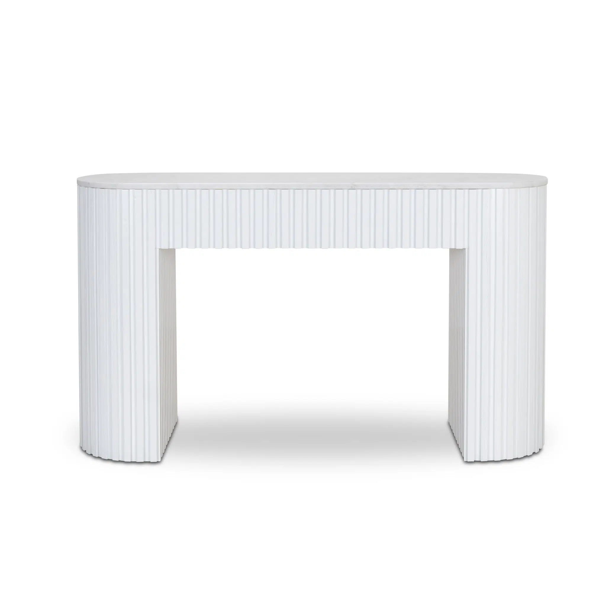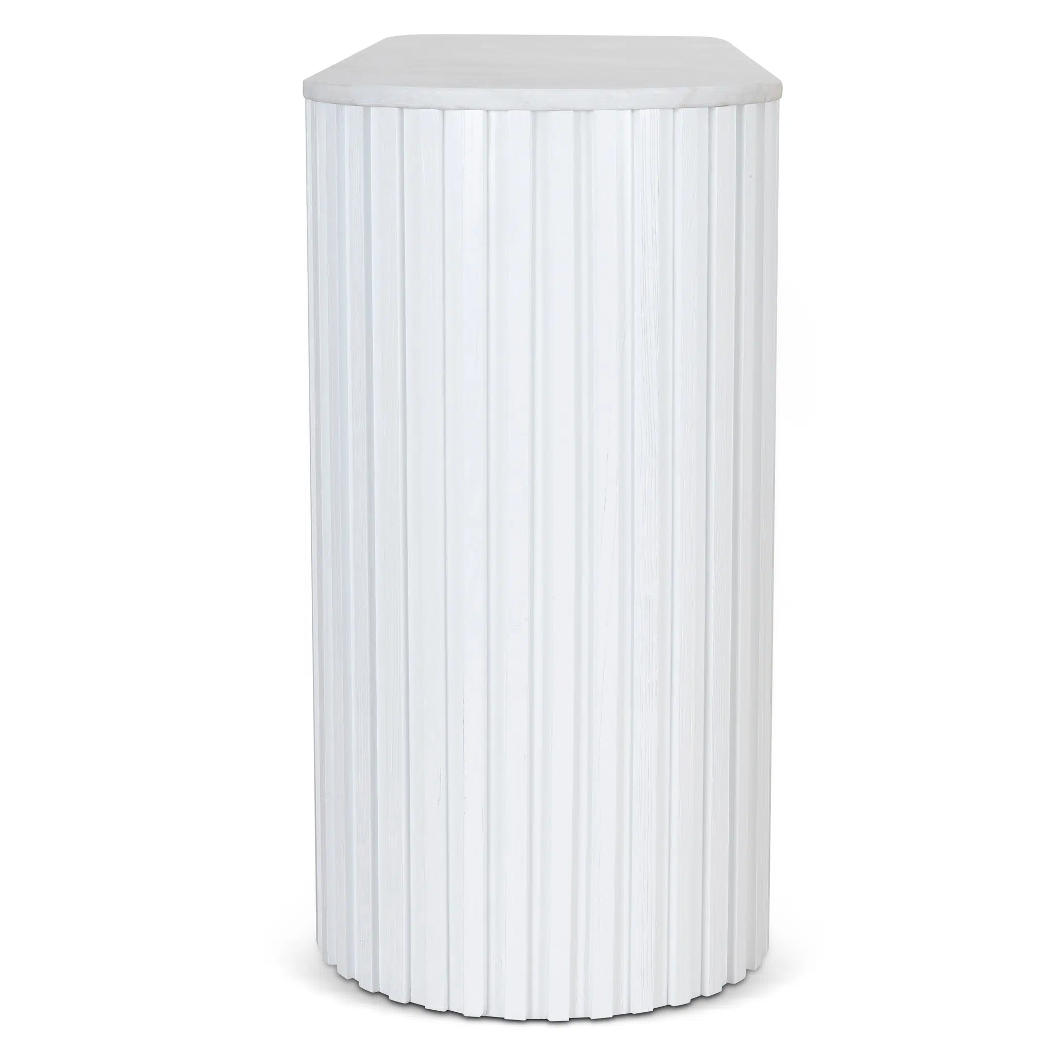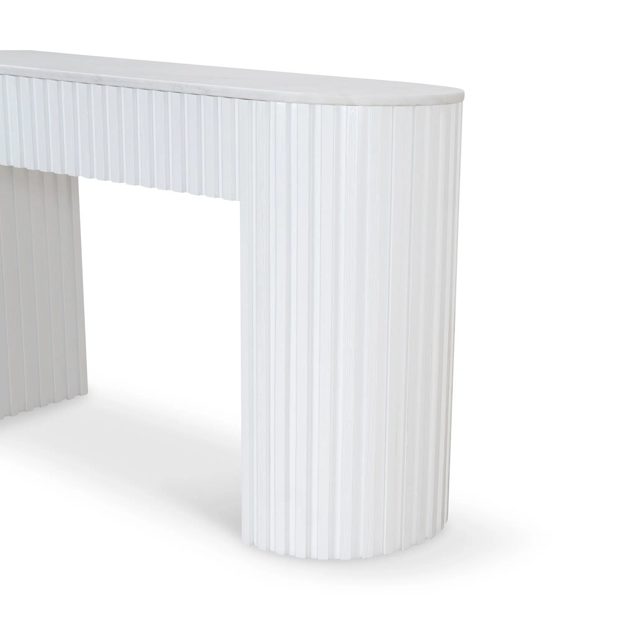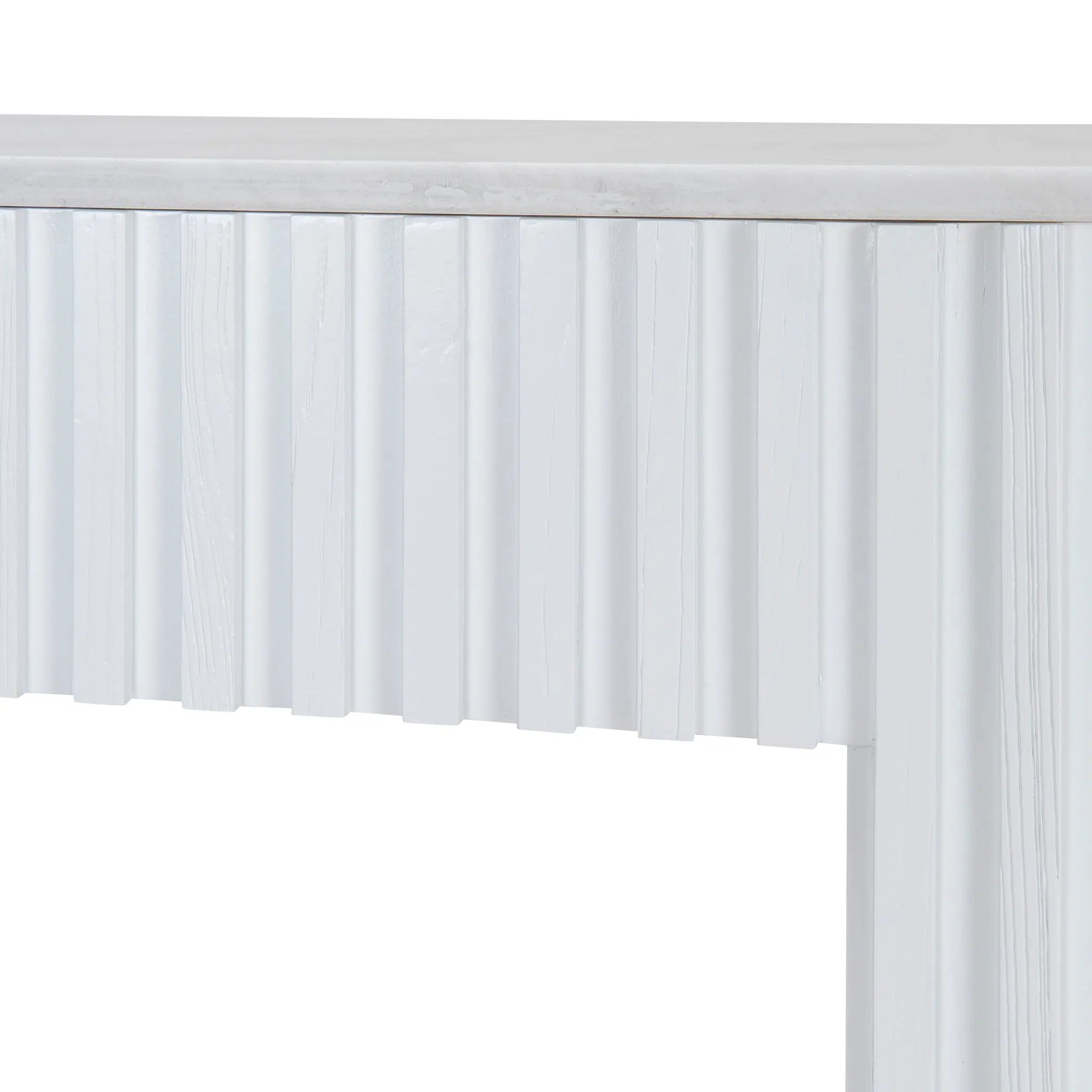 This console table features a modern, minimalist silhouette with a marble top surface that exudes luxury. Its bold cylindrical legs crafted from solid elm wood with a natural veneer add a sculptural element, while the ribbed structure provides a grounded, robust aesthetic. The timeless design seamlessly complements both contemporary and classic interiors, making it a versatile statement piece for any space.