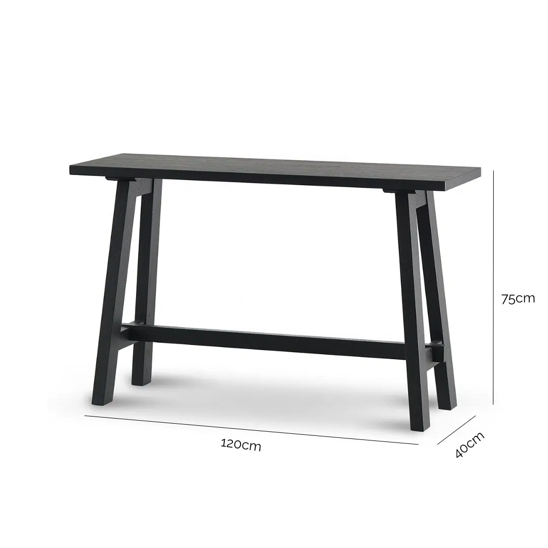 Measuring 120cm wide, 40cm deep, and 75cm high, this console table fits comfortably in narrow spaces. The 110cm-wide middle beam and 99.93cm-wide leg spacing create a stable base, while the 13.31cm table overhang allows for easy access. Its compact depth of 40cm makes it perfect for hallways, beside sofas, or as a transitional piece between rooms.