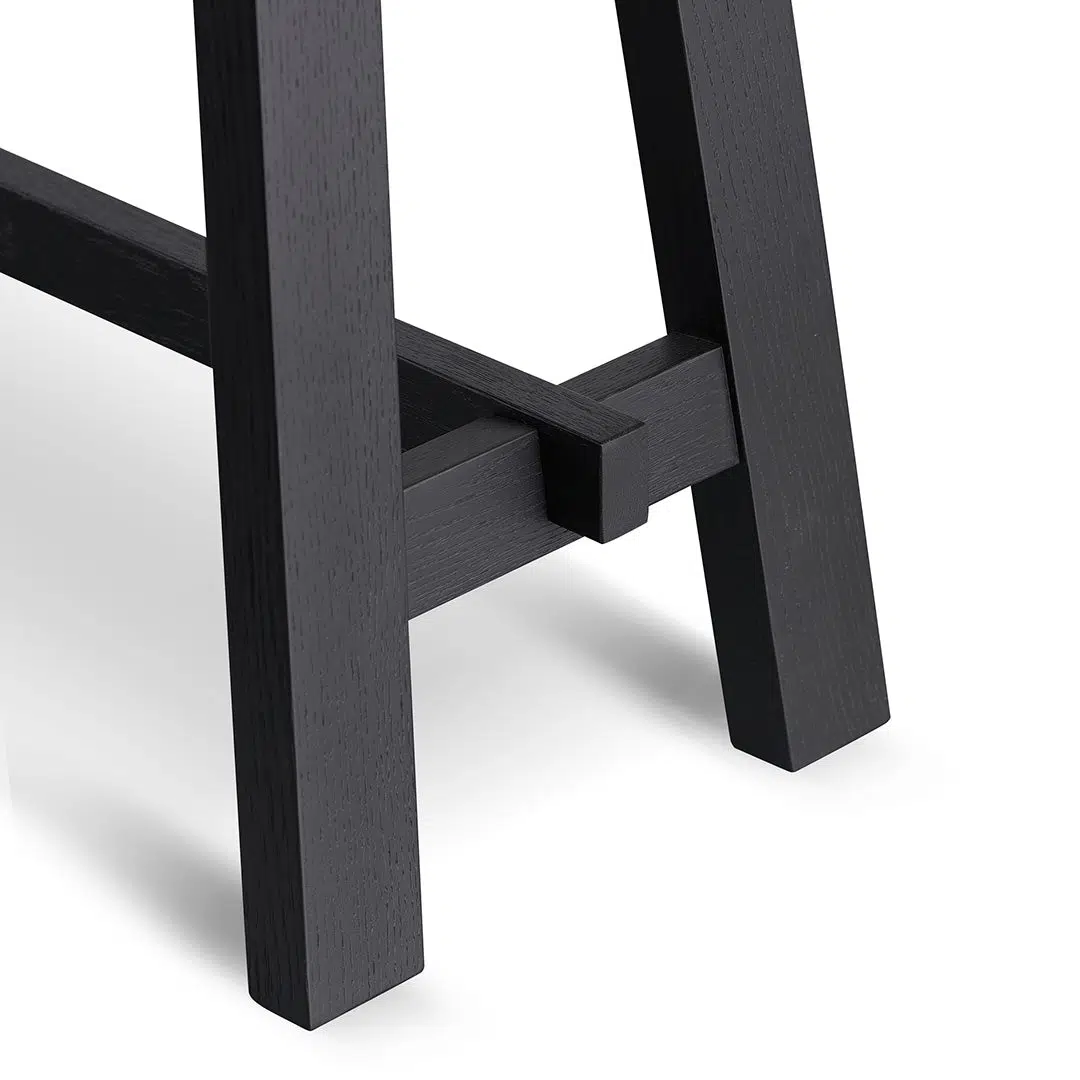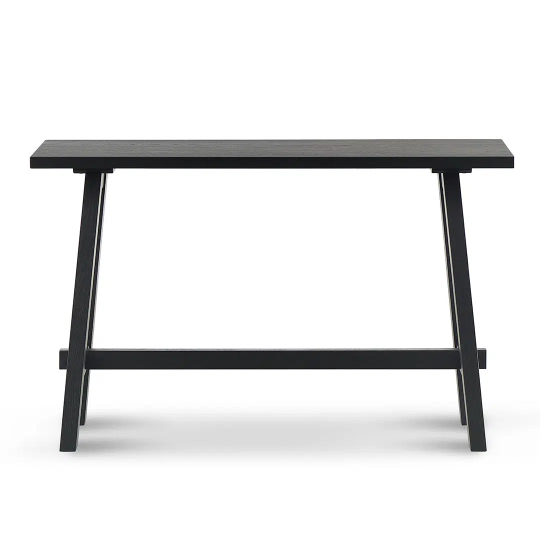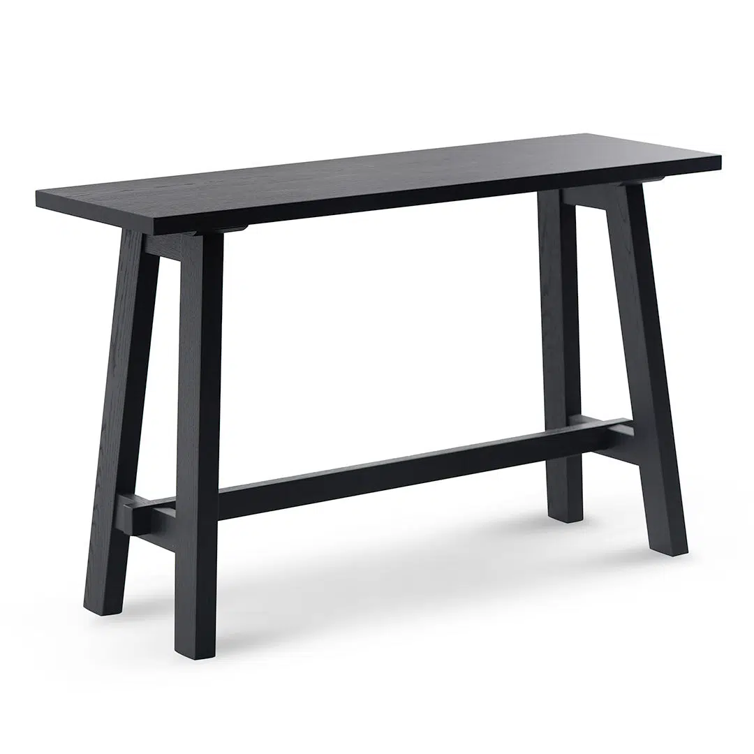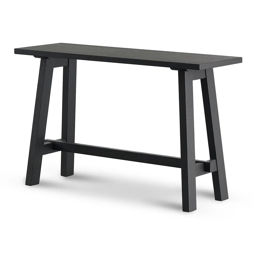 This 1.2m wooden console table in full black exudes timeless elegance with its sleek, minimalist silhouette. The luxurious veneer wood surface features a subtle wood texture finish, creating a sophisticated contrast against the matte black paint. Its streamlined design seamlessly complements modern living rooms, entryways, or commercial spaces, offering both visual appeal and functional versatility.