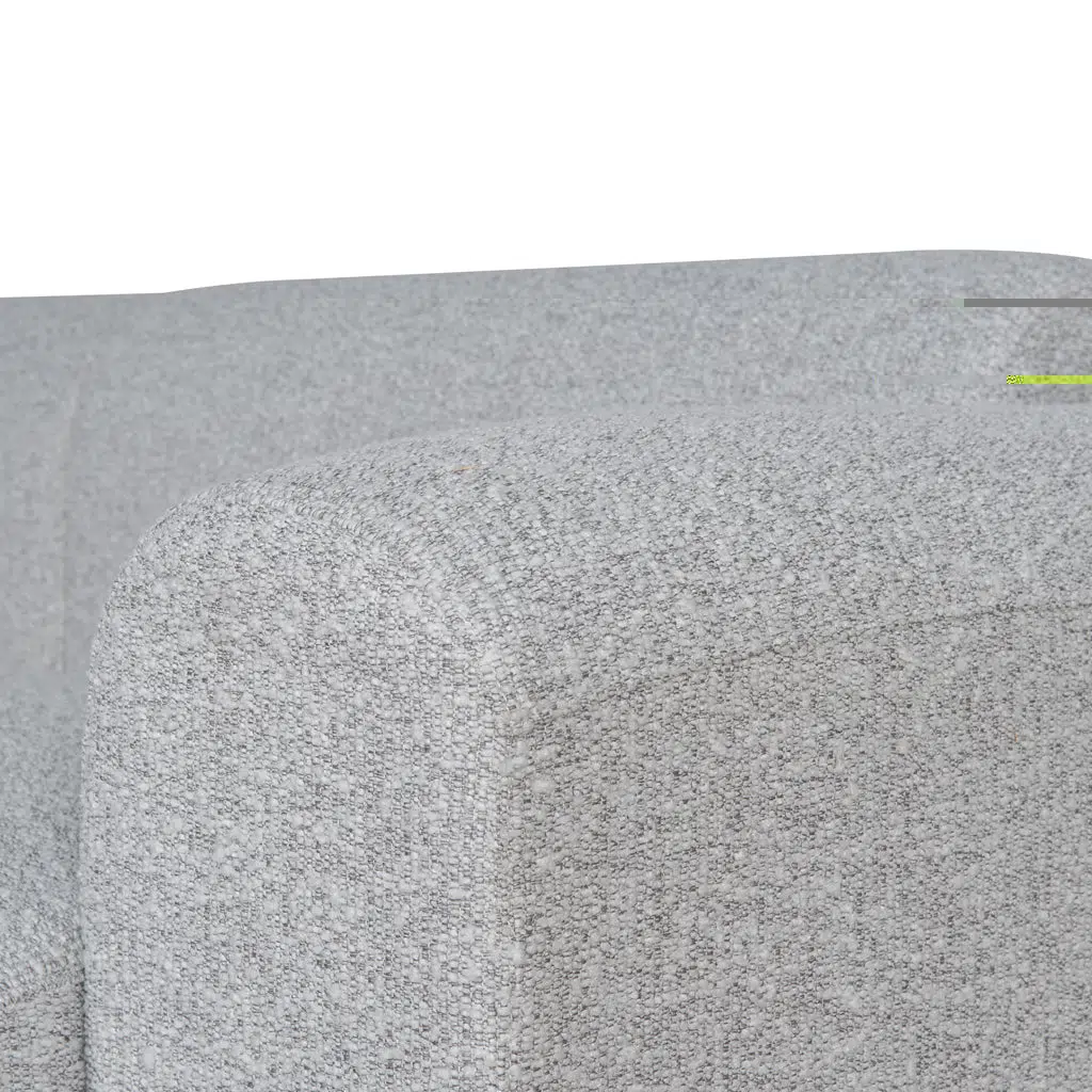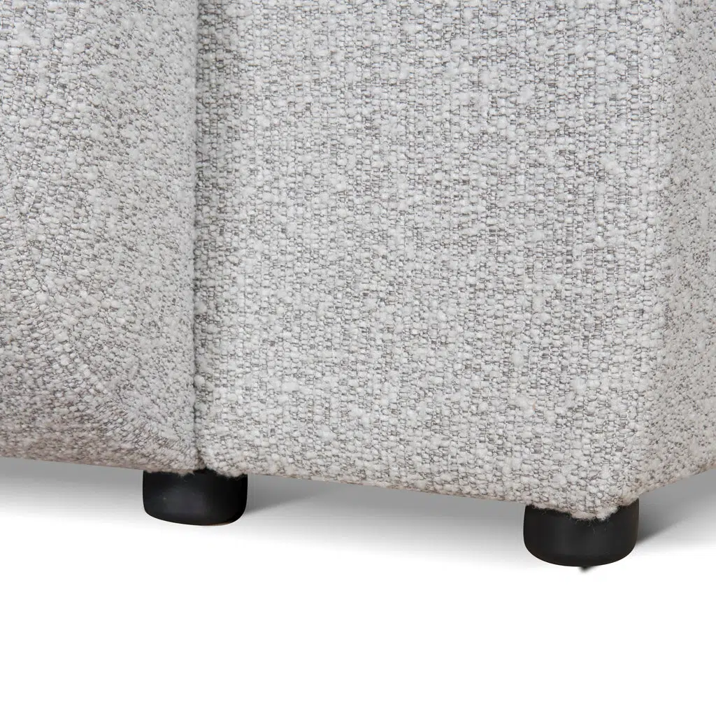 The silver grey boucle upholstery combines polyester’s durability with a tactile, textured finish that resists pilling. Reinforced with an engineered wood frame and rubber string/spring suspension system, it ensures stability and even weight distribution. Foam-filled cushions retain their shape while providing adaptive softness for everyday use.