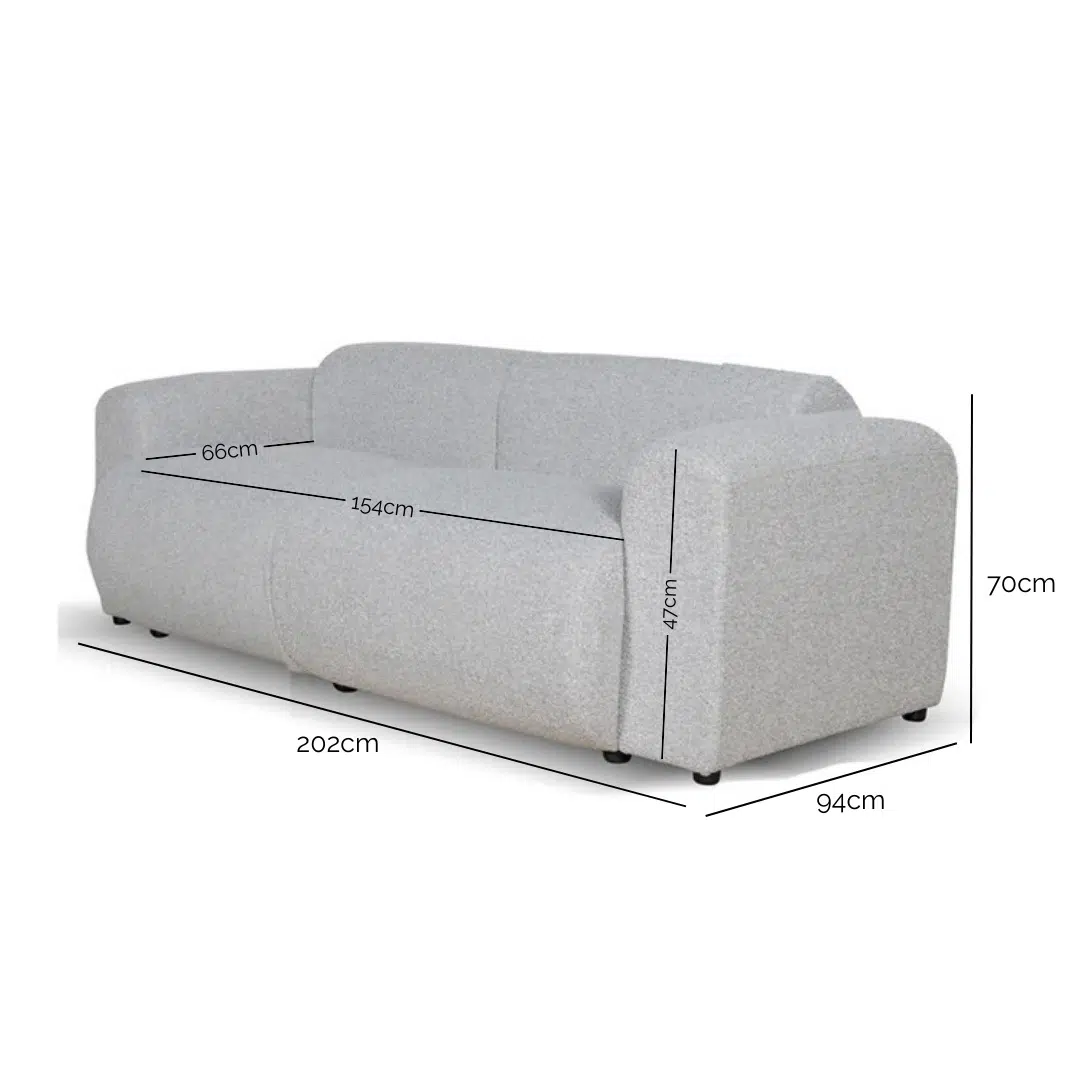 This three-seater sofa in silver grey boucle fabric merges modern aesthetics with functional design, creating a centerpiece for contemporary living spaces. Measuring 202cm wide with a 154cm seat span, it provides ample room for relaxation while maintaining a sleek silhouette ideal for both large and medium-sized rooms.