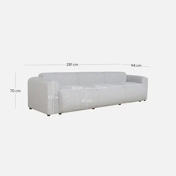 Designed for relaxation, the sofa offers a spacious 233cm wide seating area with deep, wide cushions (66cm depth and 47cm seat height) that cradle the body. Its low-profile arms (57cm height) and 3cm leg clearance enhance accessibility, while the overall 281cm width makes it ideal for family lounging or hosting guests in style.