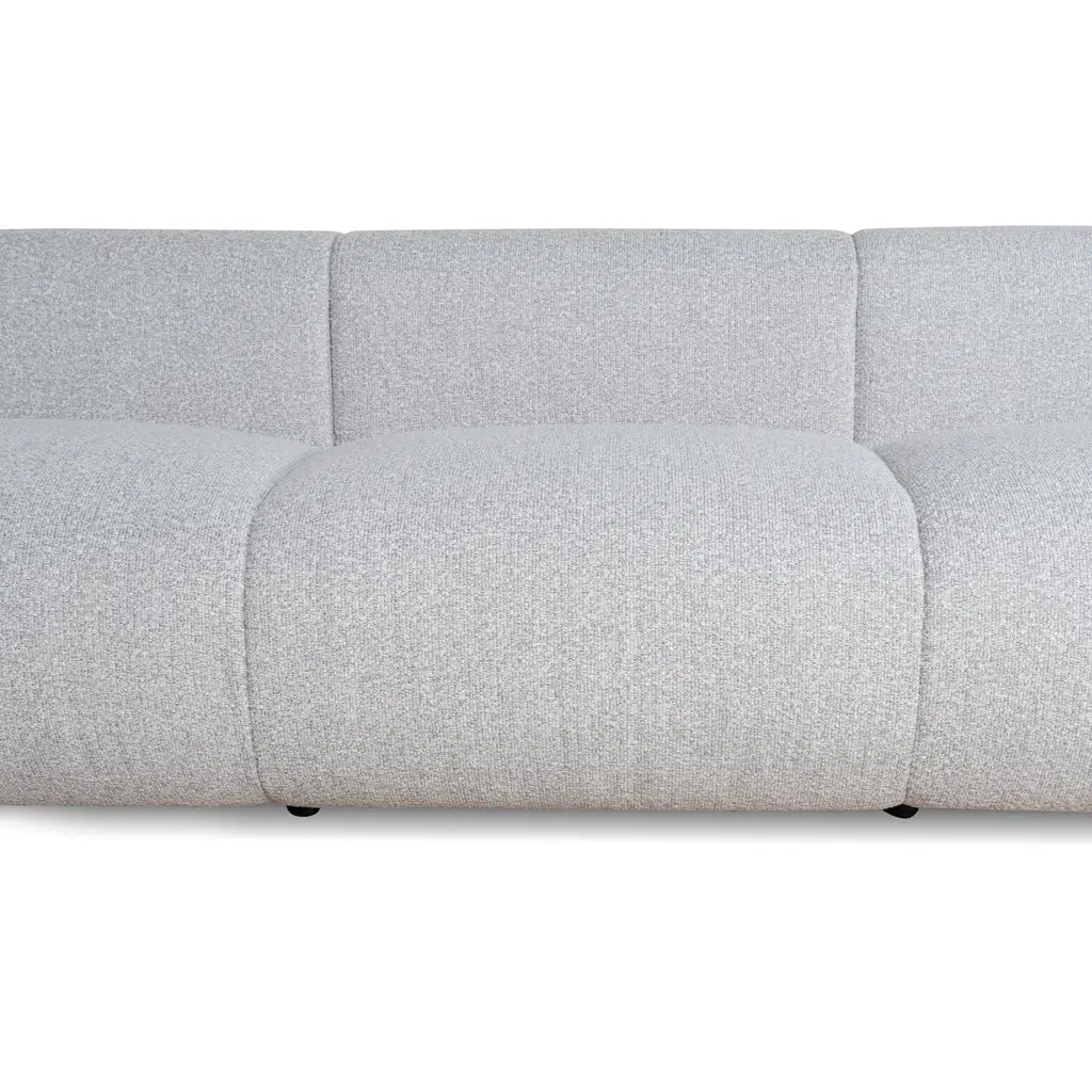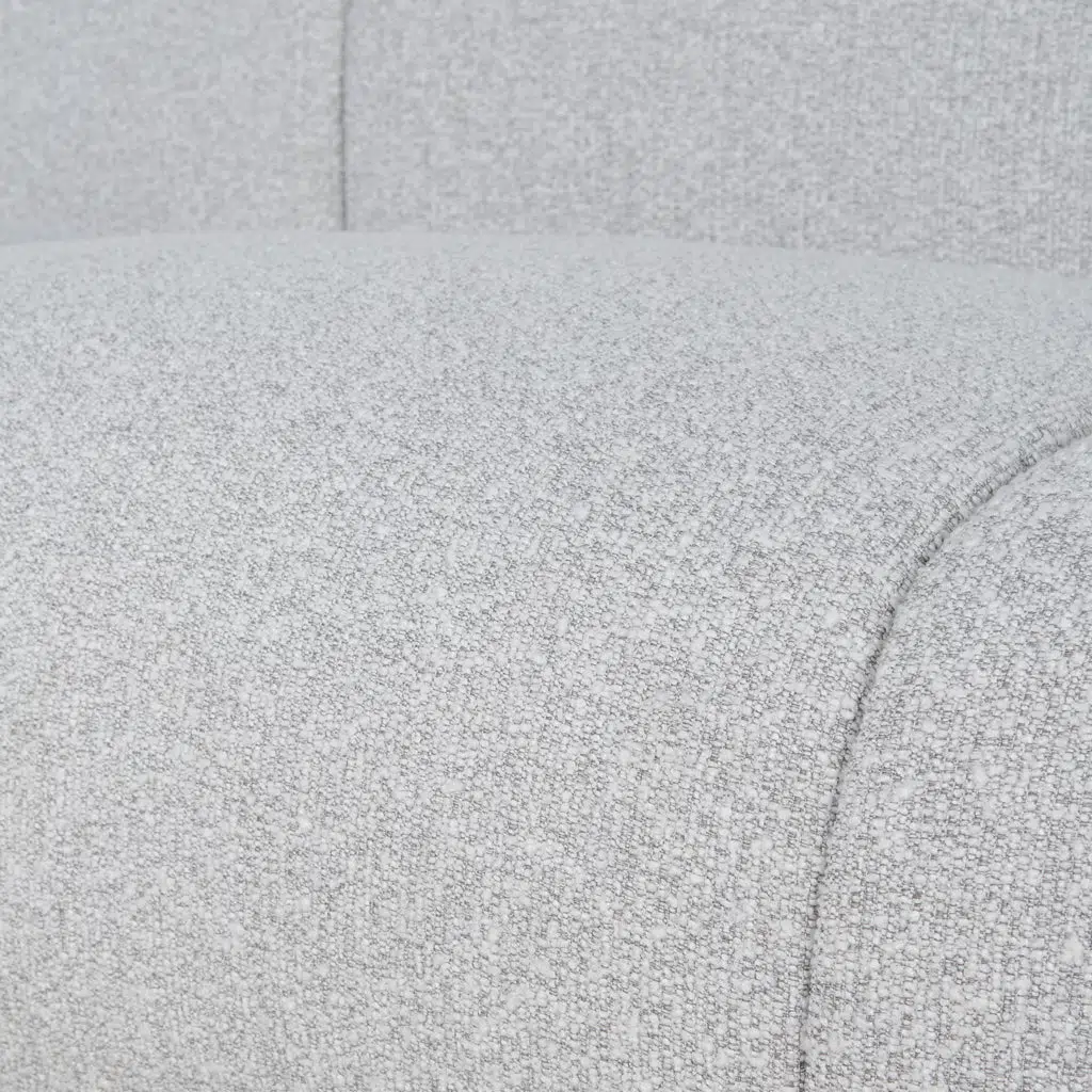 The sofa’s standout feature is its silver grey boucle upholstery, crafted from looped polyester yarn for a uniquely textured finish. This tactile fabric combines visual sophistication with soft, inviting comfort, creating a calming aesthetic in any living space. The neutral grey tones effortlessly complement contemporary interiors while adding a touch of refined luxury.