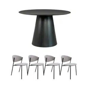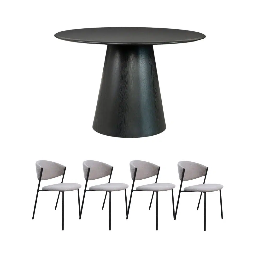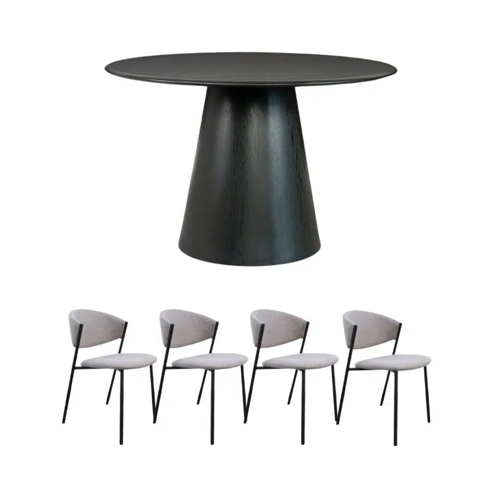 At the heart of this set is the Oliver Round Dining Table, designed with a smooth circular silhouette that encourages connection and easy conversation. Finished in a sleek black tone, the table creates a strong visual anchor while maintaining a clean, minimalist aesthetic.