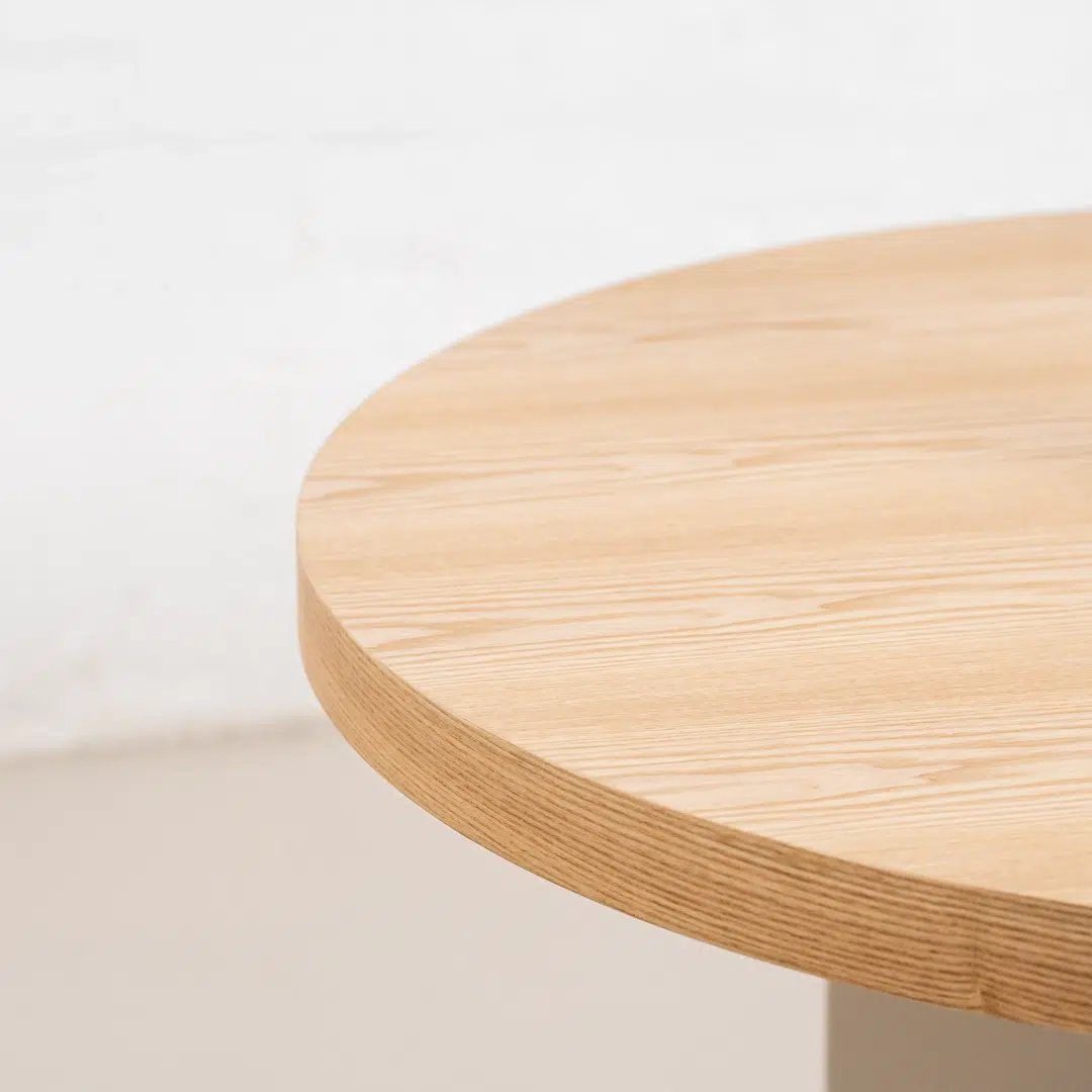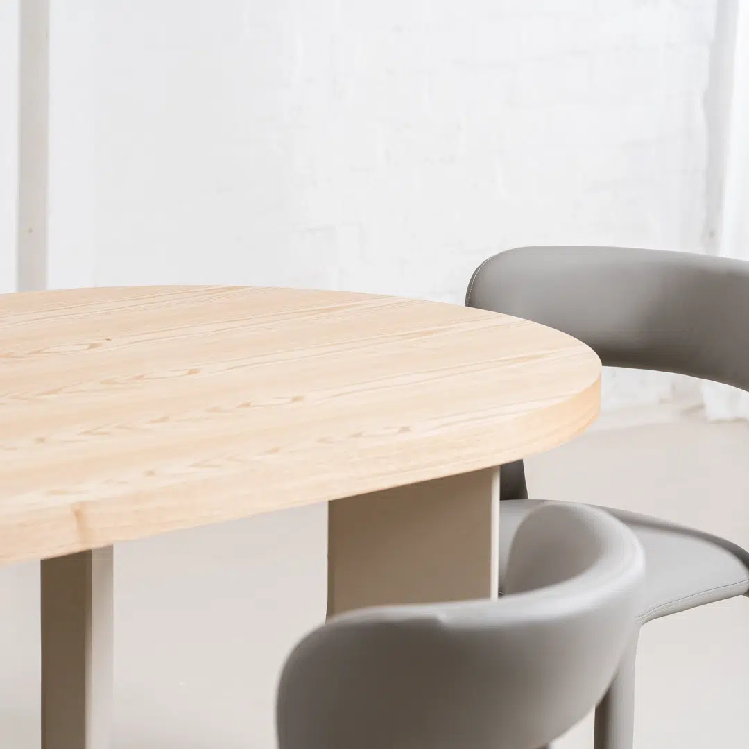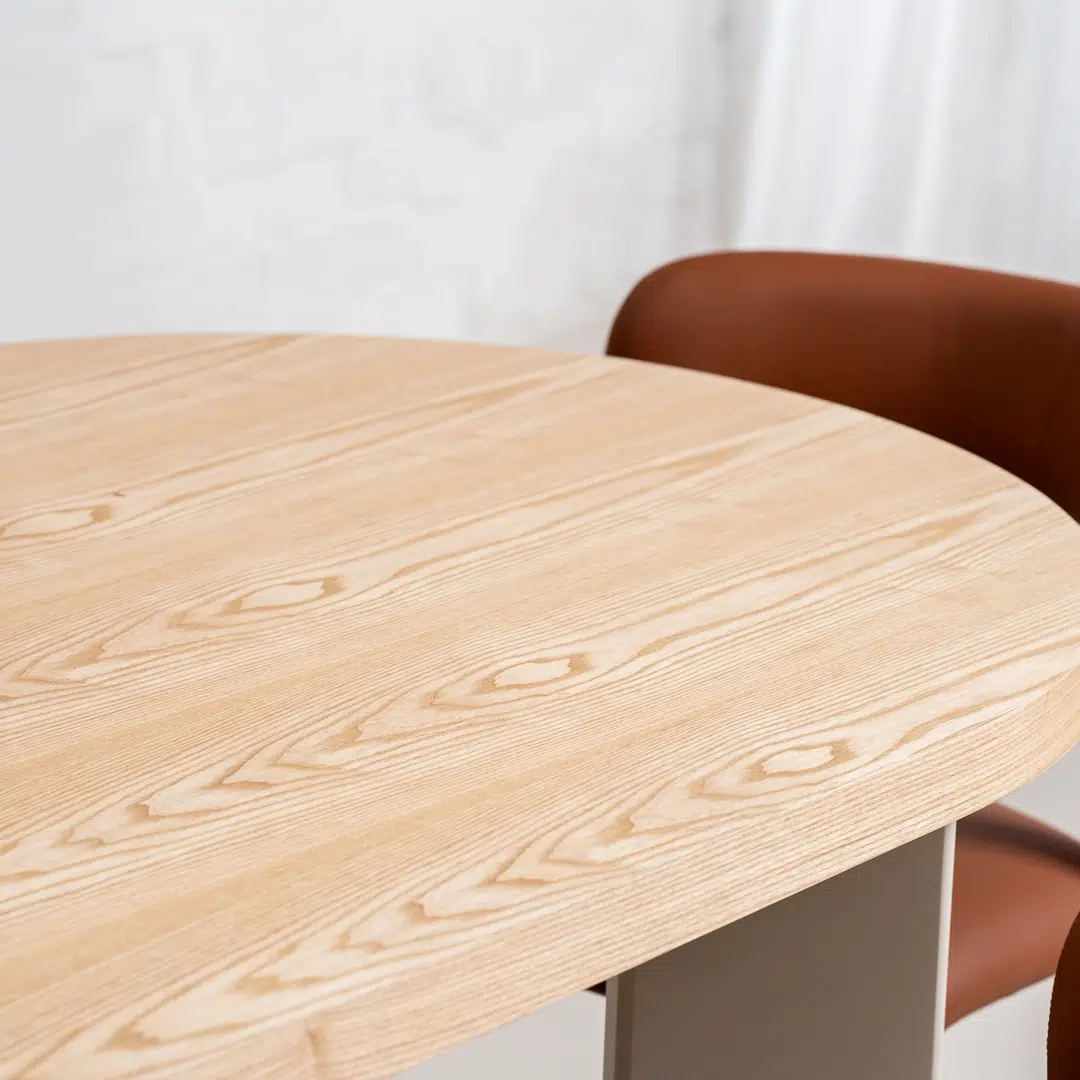 This country-style dining table masterfully blends vintage-inspired appeal with contemporary sophistication. Its striking ash veneer tabletop showcases the organic grain patterns of natural wood, while the creamy grey matte-painted legs add a fresh, modern contrast. The combination of warm wood tones and neutral grey creates a versatile centerpiece that exudes both nostalgia and minimalist chic, perfect for creating a welcoming dining atmosphere.