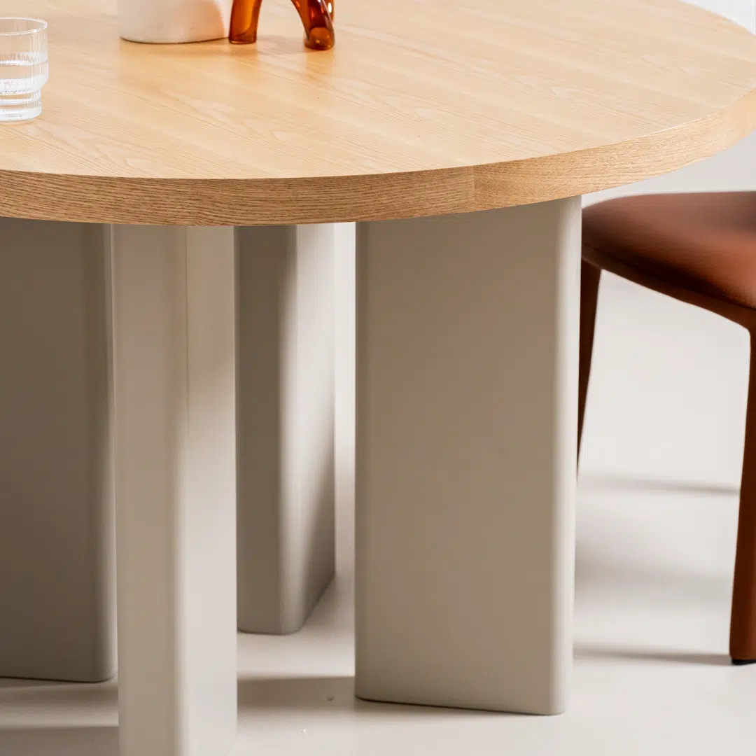 This dining table masterfully blends rustic charm with modern elegance, featuring a striking ash veneer tabletop that showcases the organic beauty of natural wood grain. The creamy grey painted base adds a contemporary touch through its smooth matte finish, creating a harmonious contrast between traditional craftsmanship and sleek, modern aesthetics. Ideal for elevating both casual and formal dining spaces, its versatile design seamlessly integrates into farmhouse, modern rustic, or transitional interiors.