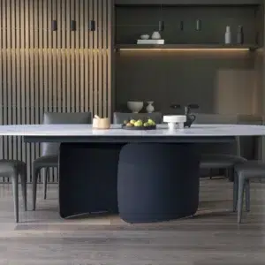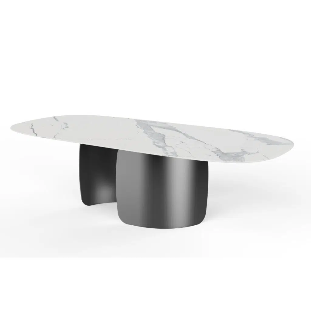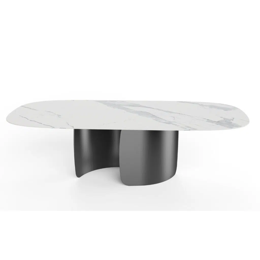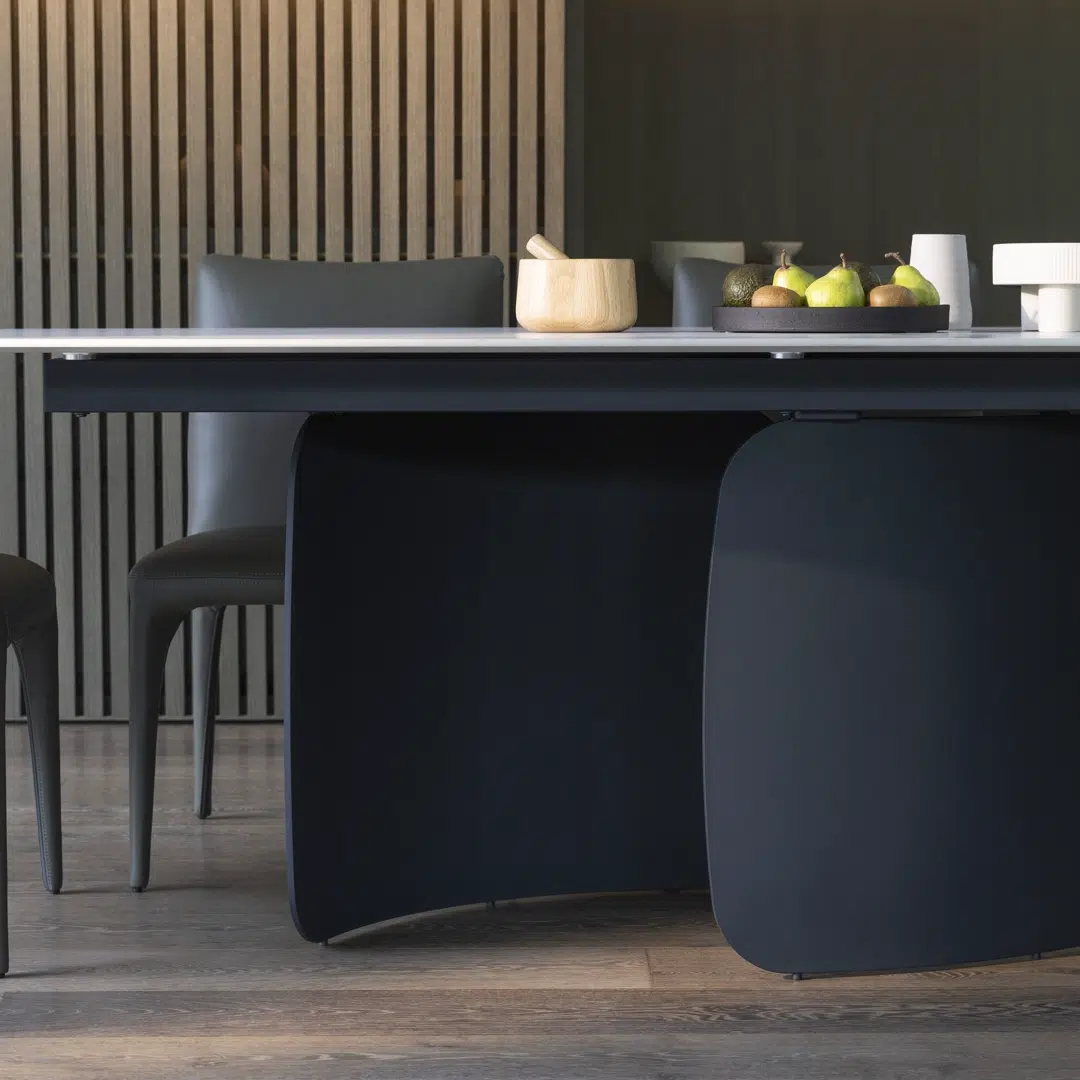 This contemporary dining table redefines modern elegance with its seamless blend of style and practicality. The sleek, curved table top crafted from 15mm matte ceramic with a marble-effect finish on tempered glass creates a striking centerpiece for any dining space. Complemented by a black powder-coated steel frame featuring fluid, curved lines, its minimalist aesthetic effortlessly elevates modern interiors while ensuring lasting durability.
