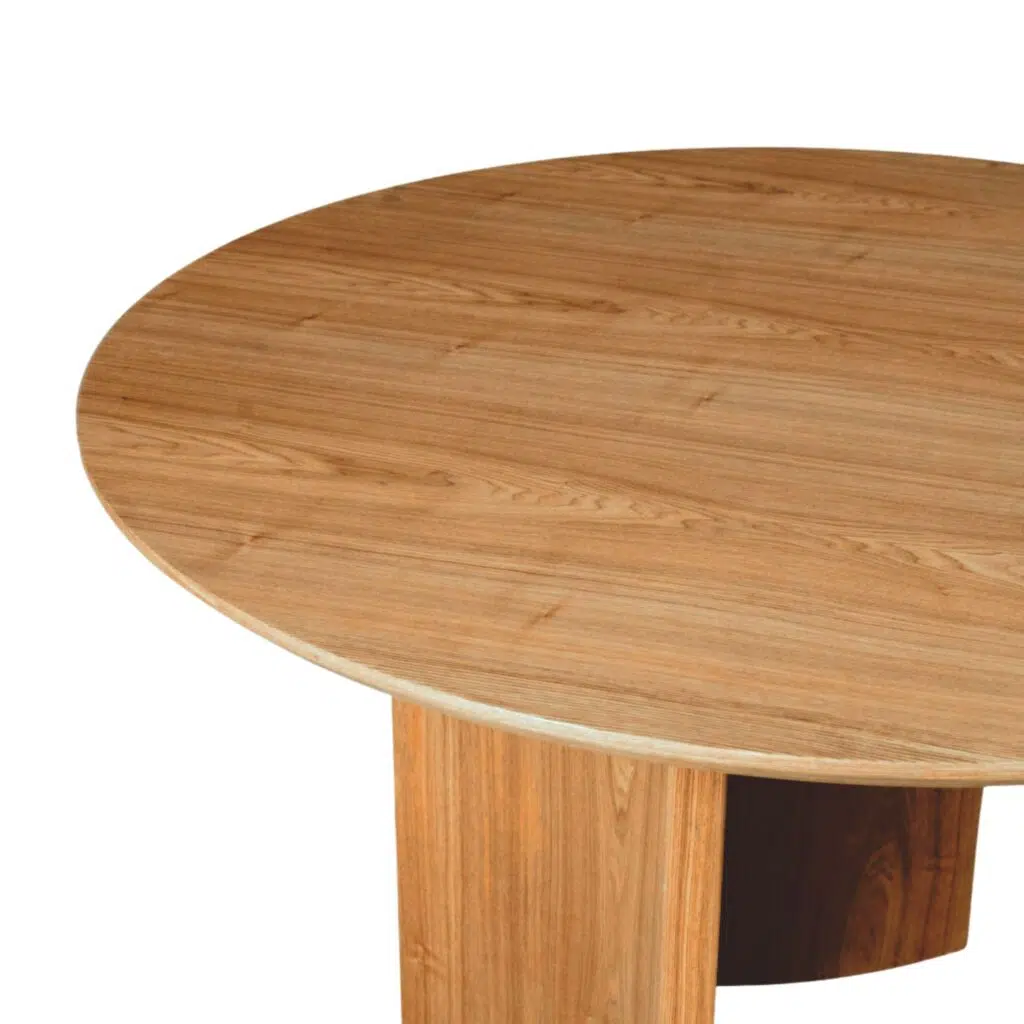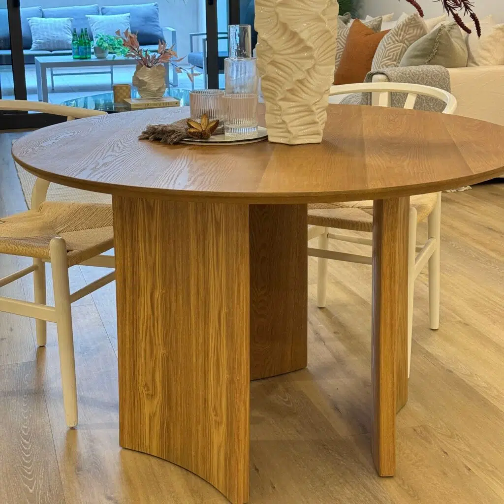 Gather around for meals with ease. The natural oak finish feels warm, and the pillar base adds a modern, sculptural touch to the room.