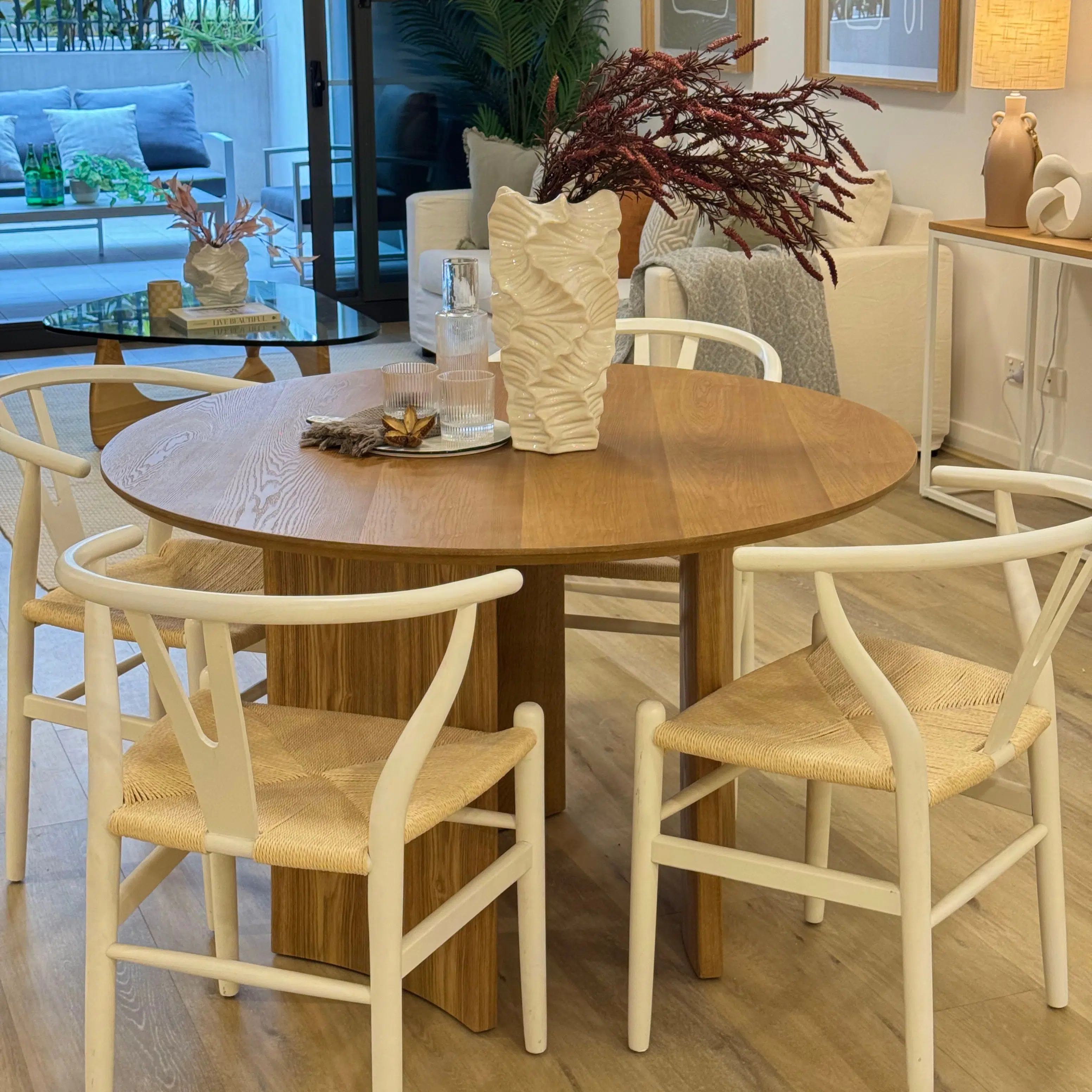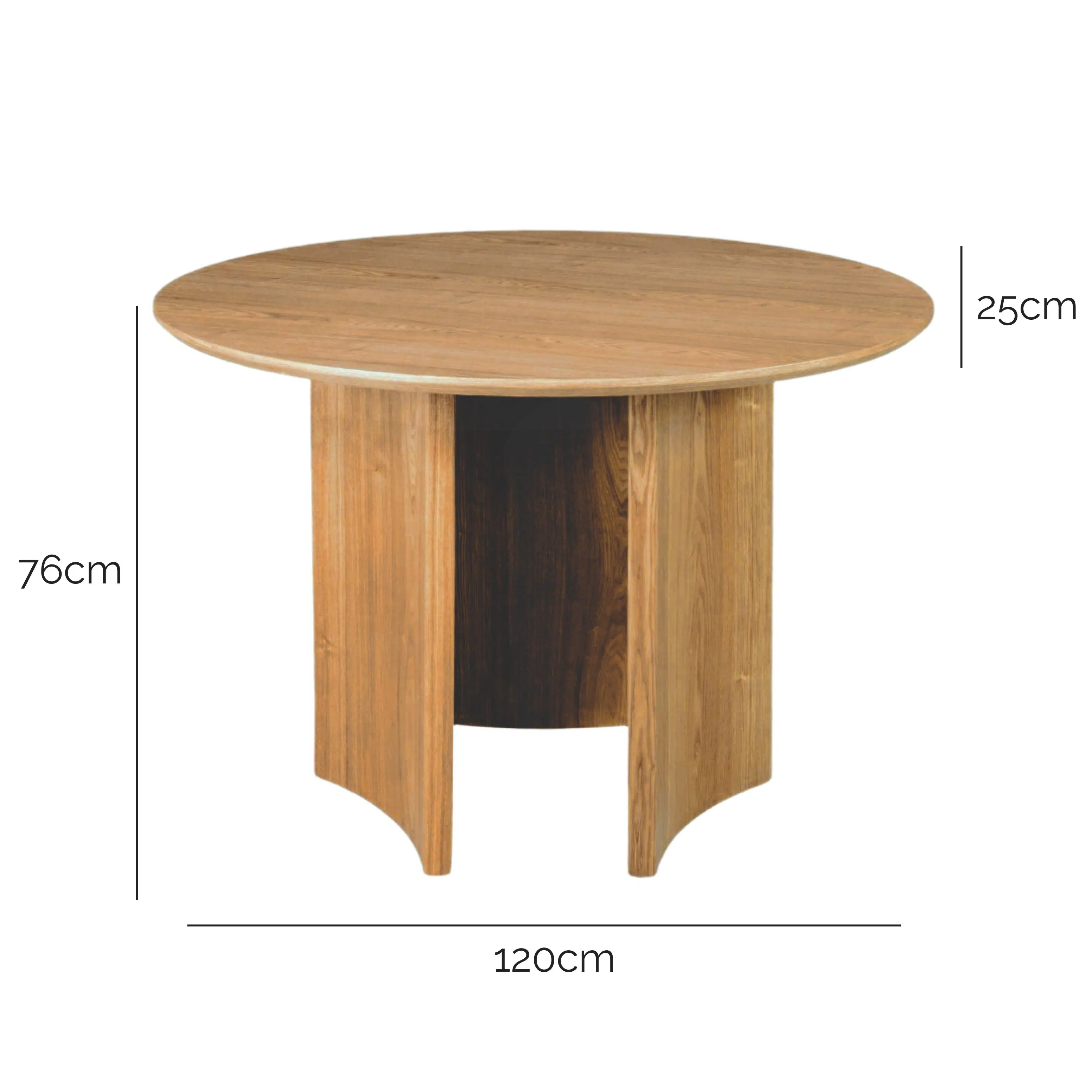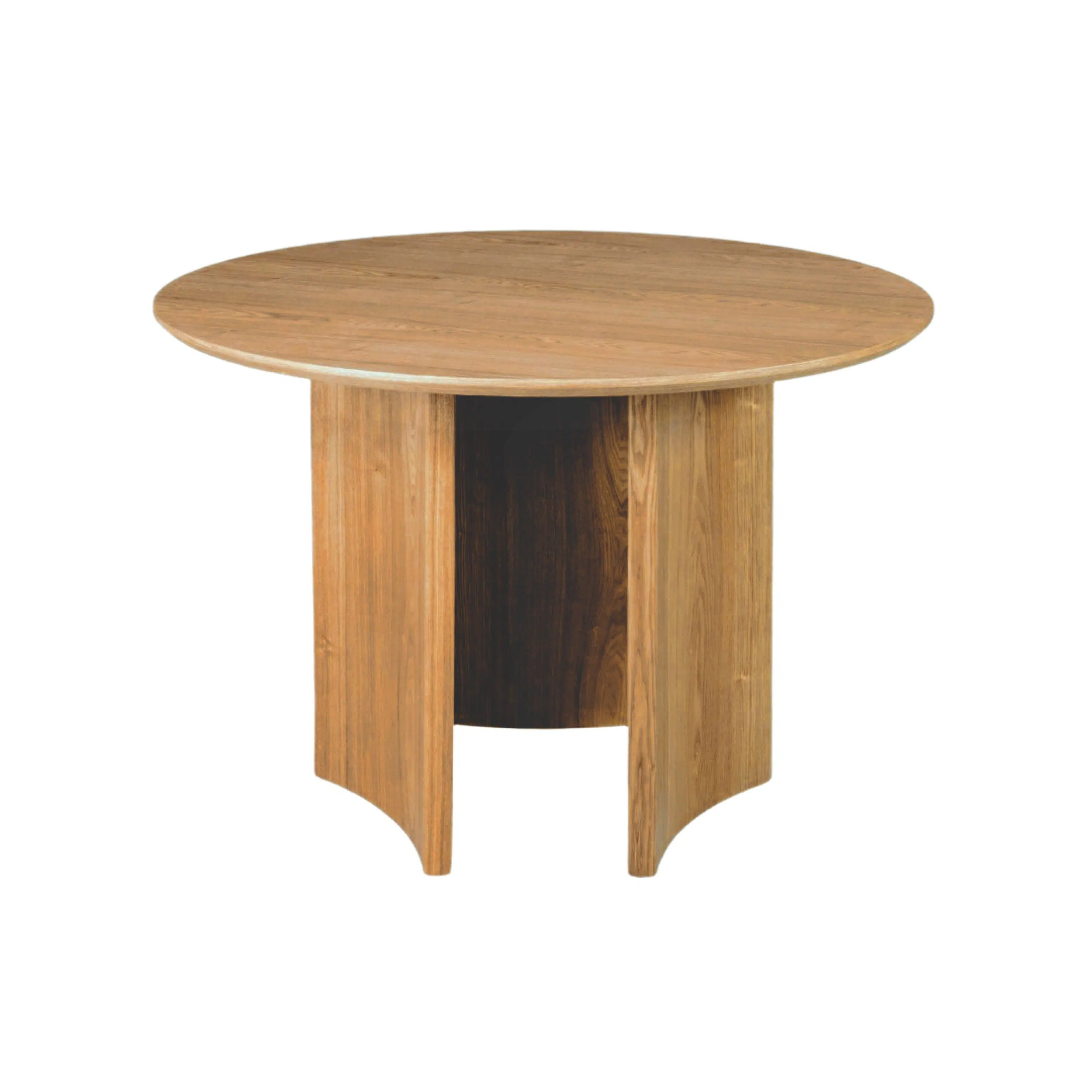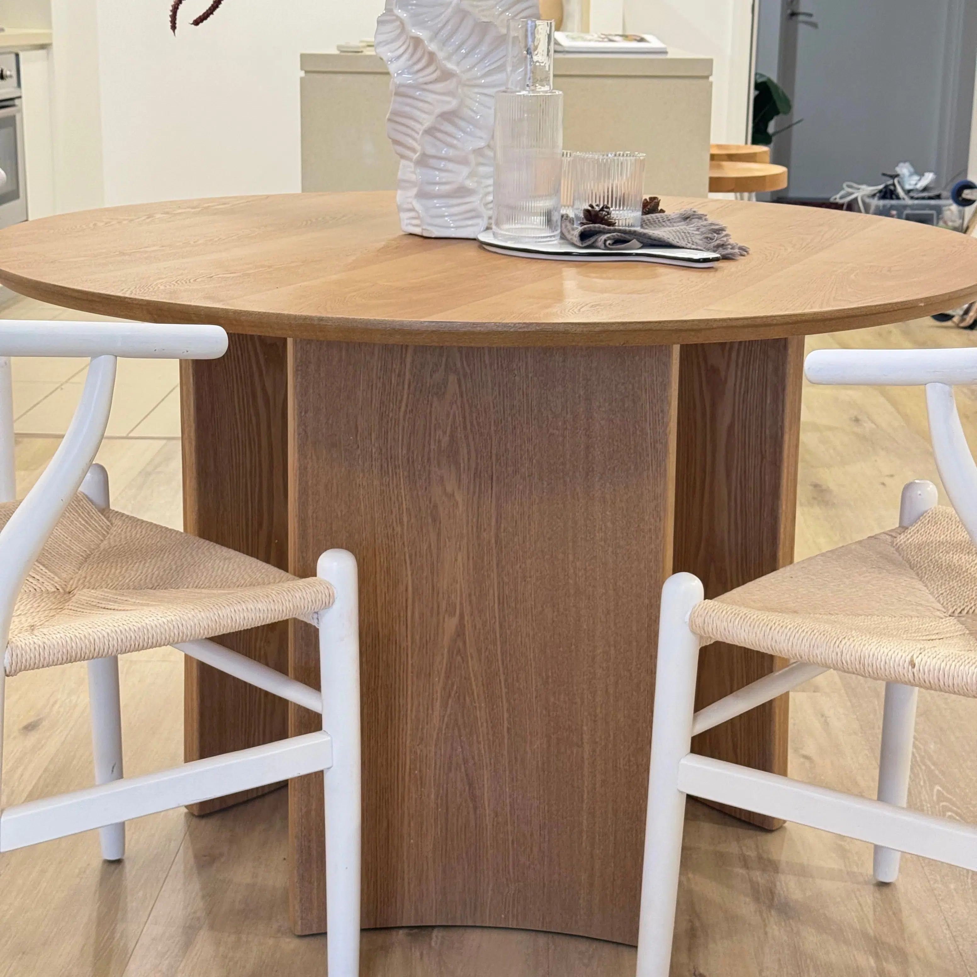 Gather around for meals with ease. The natural oak finish feels warm, and the pillar base adds a modern, sculptural touch to the room.
