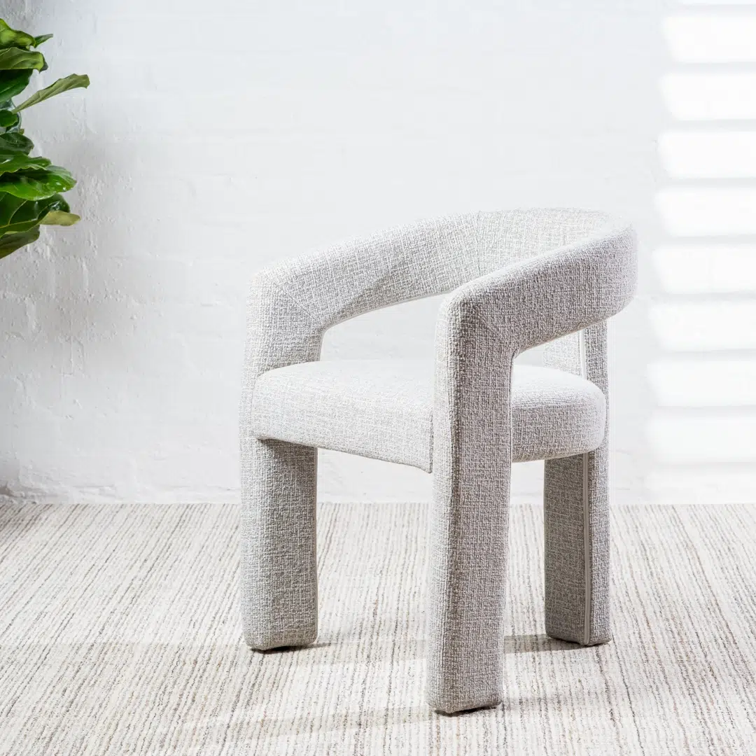 Transform your dining space with this bold yet inviting chair featuring two distinct fabric options: textured boucle or smooth linen. Choose from warm sand or vibrant orange tones to create a dynamic interplay of textures and colors in your room. The tactile boucle fabric adds depth and dimension, while the linen upholstery offers a crisp, refined finish – both designed to complement contemporary interiors.