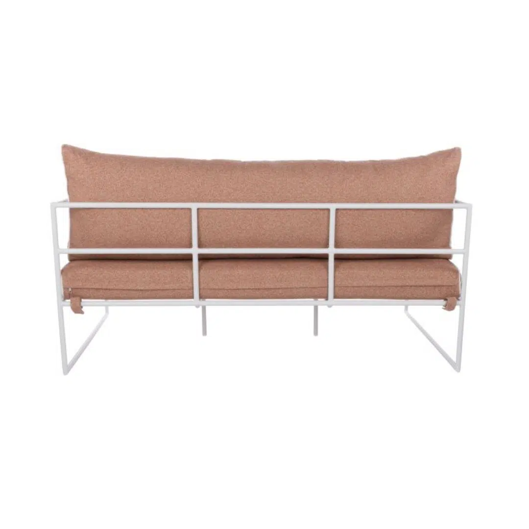 Featuring a minimal frame, this sofa offers an elegant aesthetic that enhances any outdoor setting. The plush cushions in coral pink with white piping add sophistication and comfort.