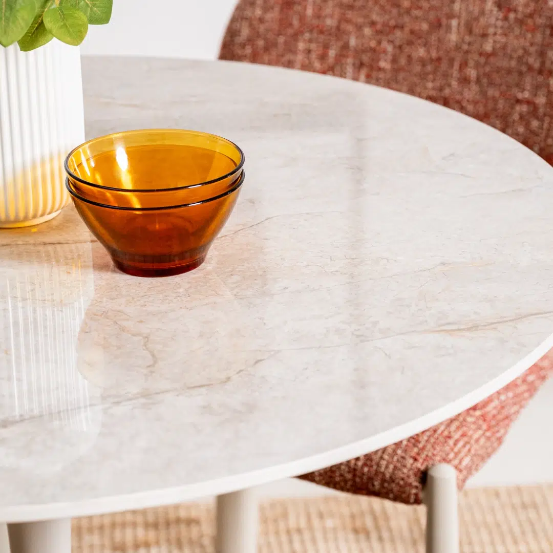 Weighing 24.2kg, the sturdy 76cm-high table combines a reinforced ceramic surface with a cappuccino powder-coated metal frame, offering stability and resistance to daily wear. The glossy ceramic finish mimics natural marble patterns, adding sophistication without compromising on resilience. Its heat-resistant properties make it ideal for both casual meals and formal gatherings.