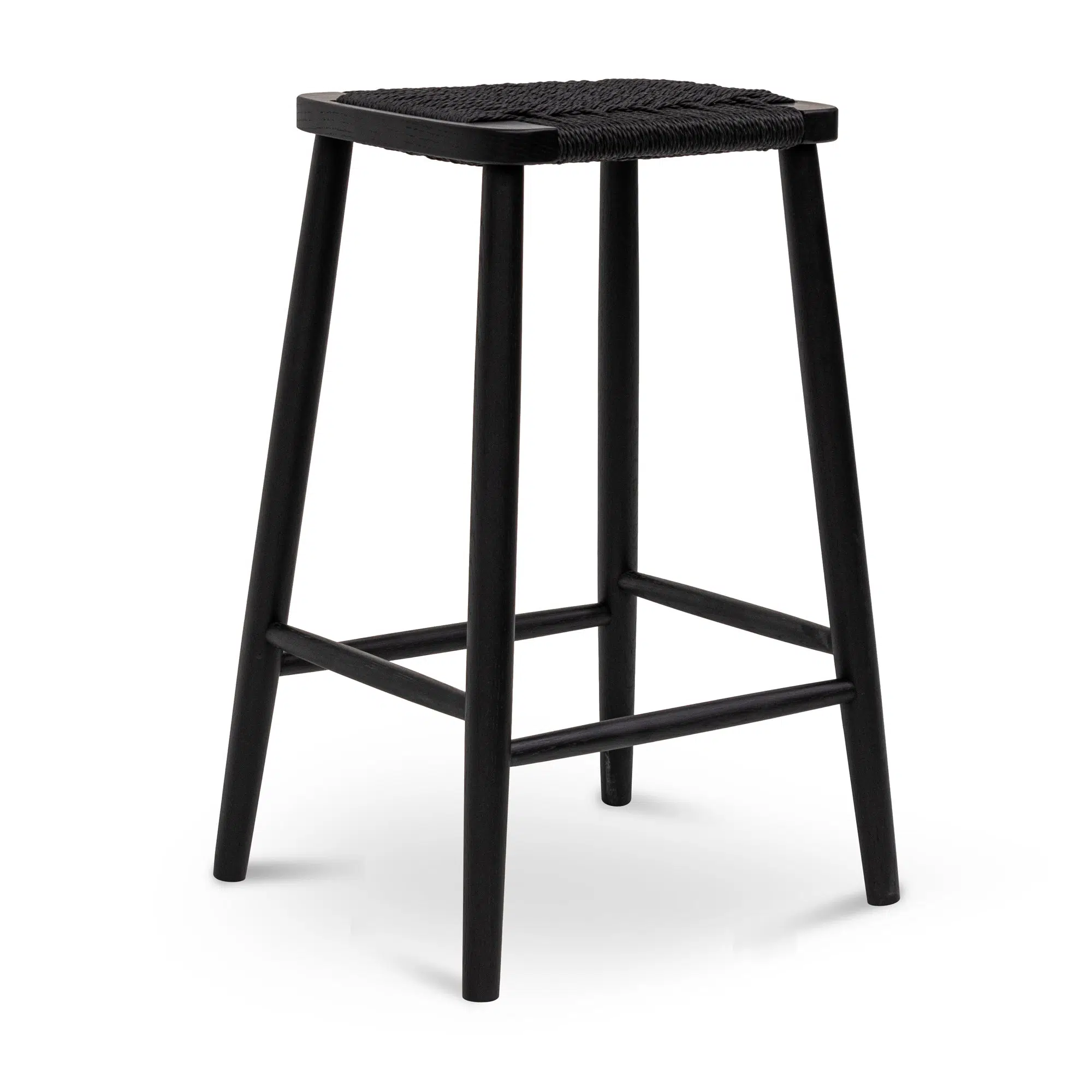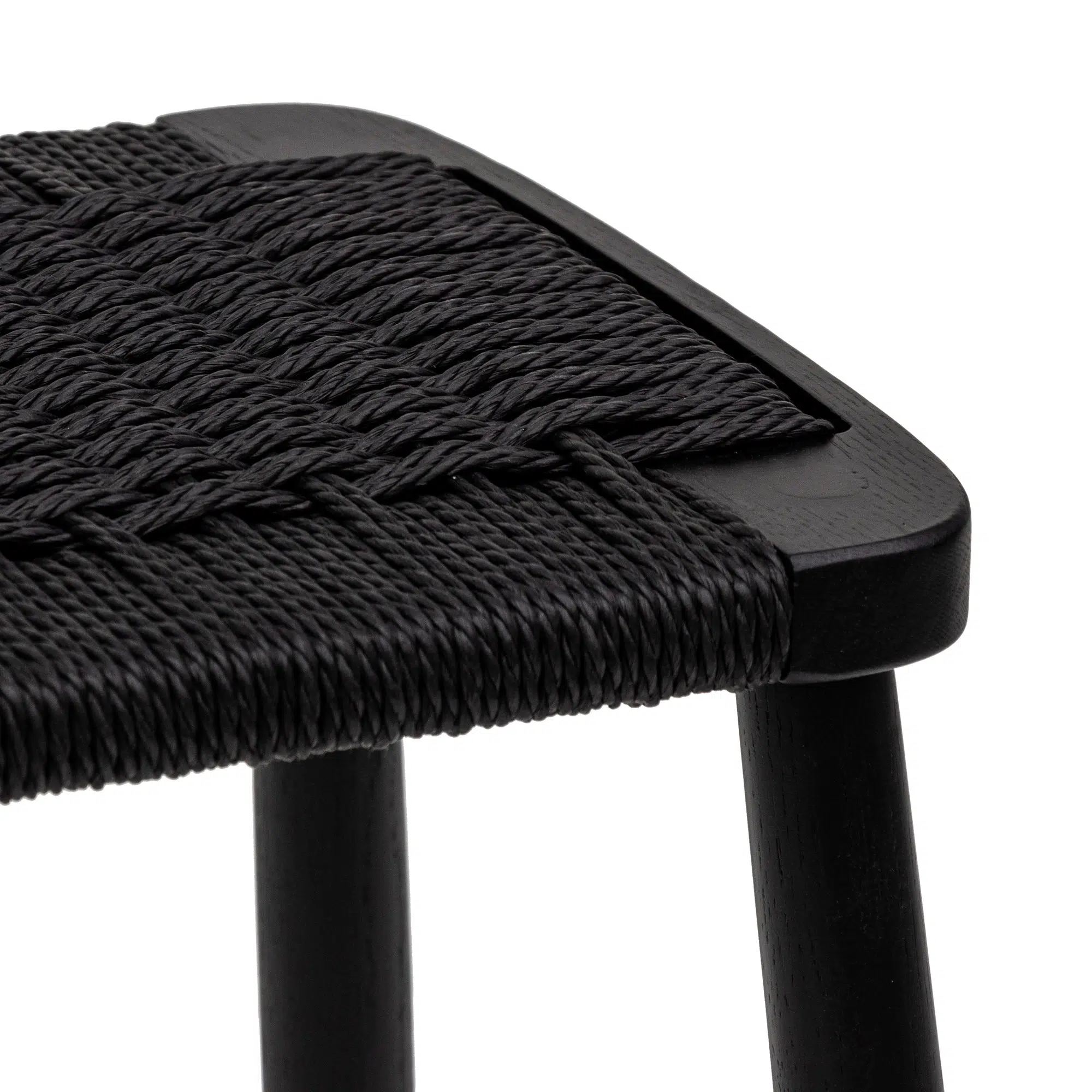 Crafted from solid black-finished oak, the stool features tapered round legs and a built-in footrest for enhanced stability and ergonomic comfort. The natural wood grain adds warmth to its contemporary design, while the protective finish resists scratches and wear in high-traffic zones.