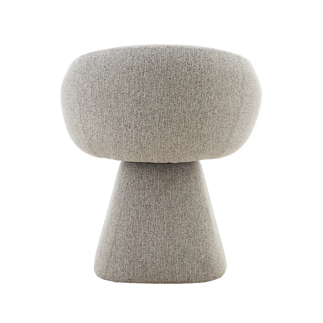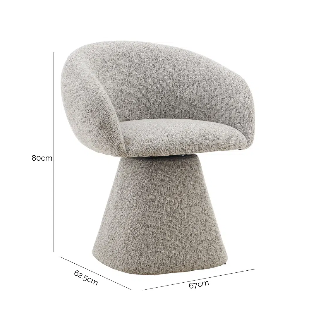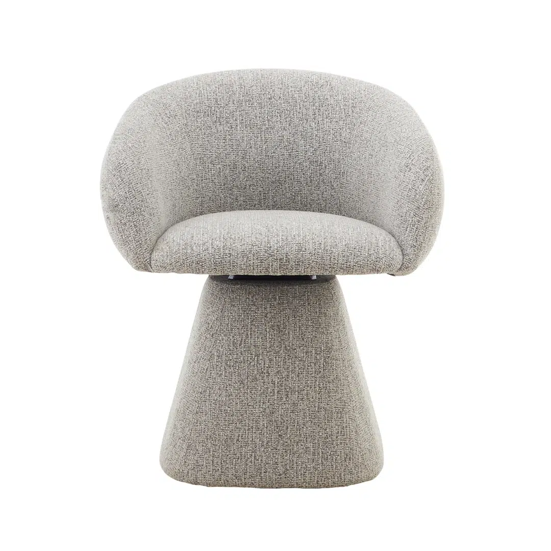 This dining chair blends elegant minimalism with refined sophistication, featuring a streamlined silhouette that complements modern and traditional interiors alike. The fossil grey polyester upholstery adds a contemporary touch, while the curved backrest and padded seat create a visually appealing yet functional design. Its 360-degree swivel base ensures effortless movement, making it ideal for bustling dining spaces or intimate gatherings.