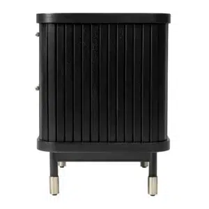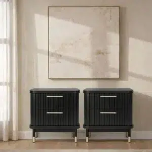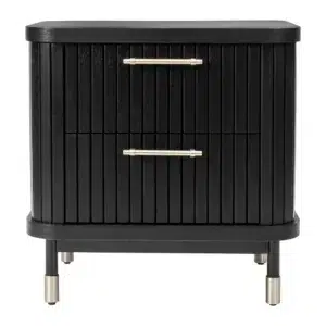 The Sophia 2 Drawer Bedside Table in black combines contemporary aesthetics with refined architectural elements. Featuring vertical fluted drawer fronts, sleek slim legs, and eye-catching brass-capped feet, this piece exudes understated luxury. Complemented by refined gold handles, it adds a touch of glamour while maintaining a clean, modern silhouette that enhances any bedroom setting.