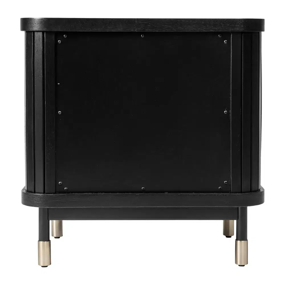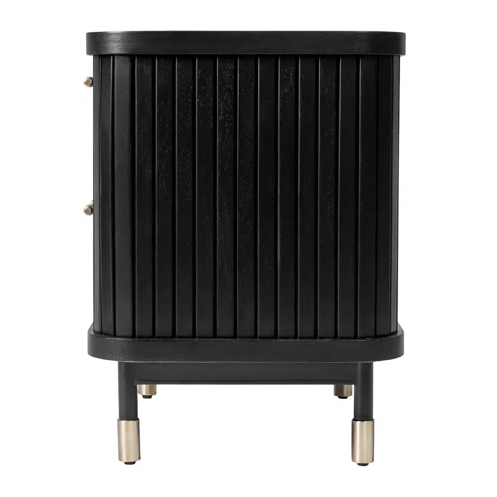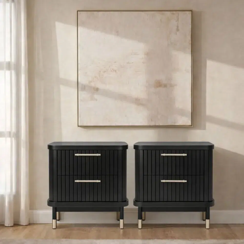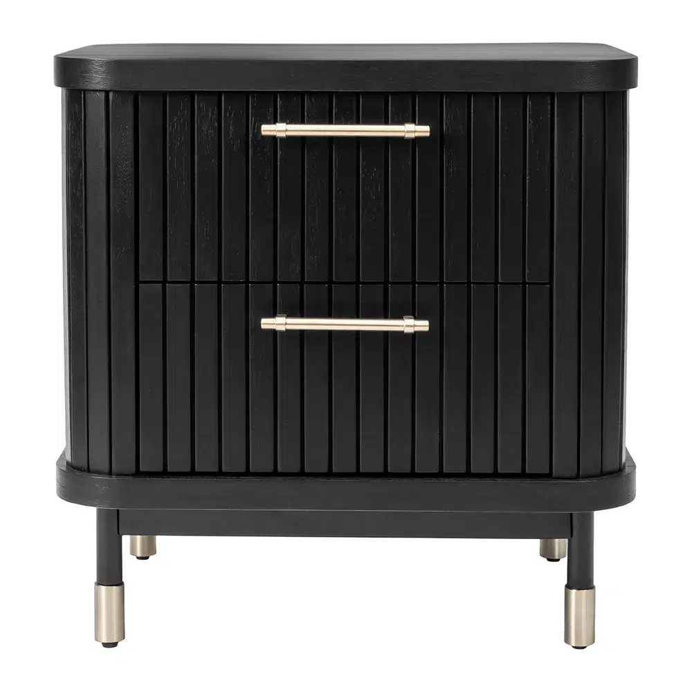 The Sophia 2 Drawer Bedside Table in black combines contemporary aesthetics with refined architectural elements. Featuring vertical fluted drawer fronts, sleek slim legs, and eye-catching brass-capped feet, this piece exudes understated luxury. Complemented by refined gold handles, it adds a touch of glamour while maintaining a clean, modern silhouette that enhances any bedroom setting.