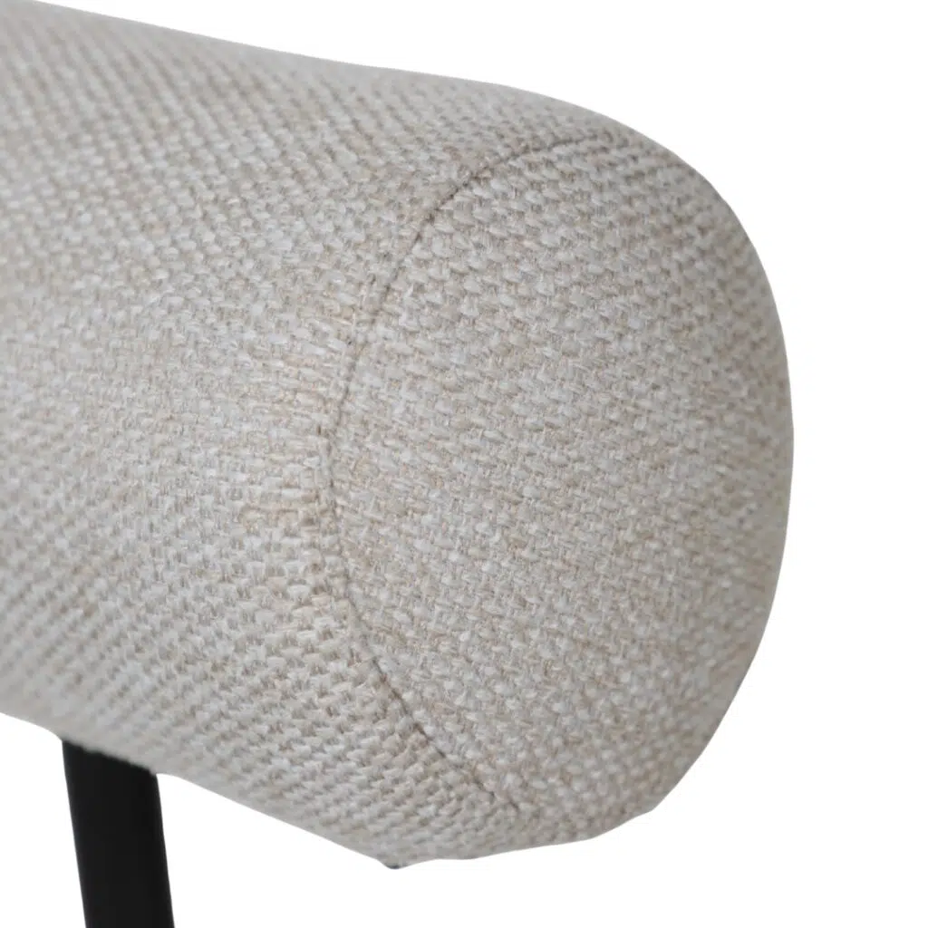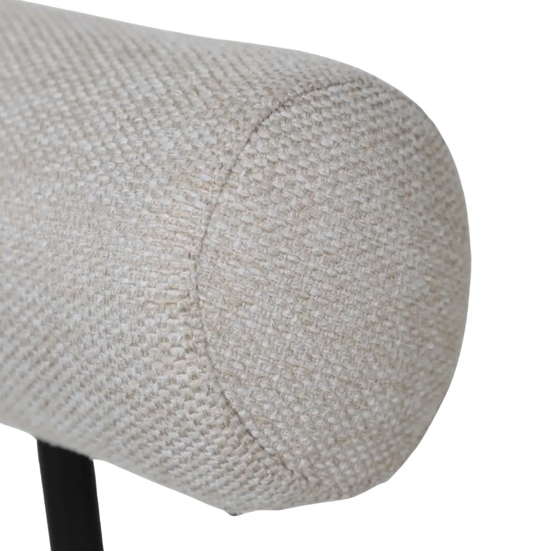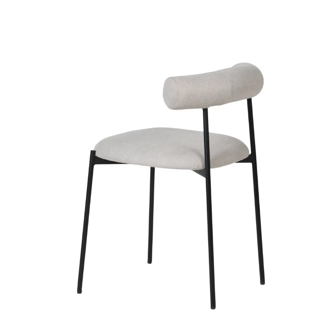 The Soren Dining Chair features a robust metal frame with black legs, providing stability and durability while contrasting elegantly with the beige upholstery.