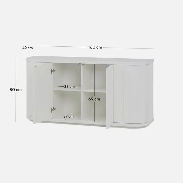 This 160cm wide buffet unit combines modern design with practical storage solutions, creating a sophisticated centerpiece for dining spaces. Its 80cm height allows effortless access to dinnerware while doubling as a stylish surface for decor or serving meals, blending functionality with visual appeal in contemporary homes.