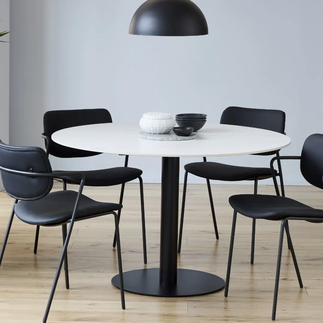 This modern dining table redefines sophistication with its matte ceramic tabletop featuring a striking marble-effect finish. The scratch-resistant surface combines practicality with luxury, while the sleek black powder-coated metal frame adds industrial charm. Perfect for family meals or casual breakfasts, its minimalist silhouette suits both urban lofts and traditional homes.