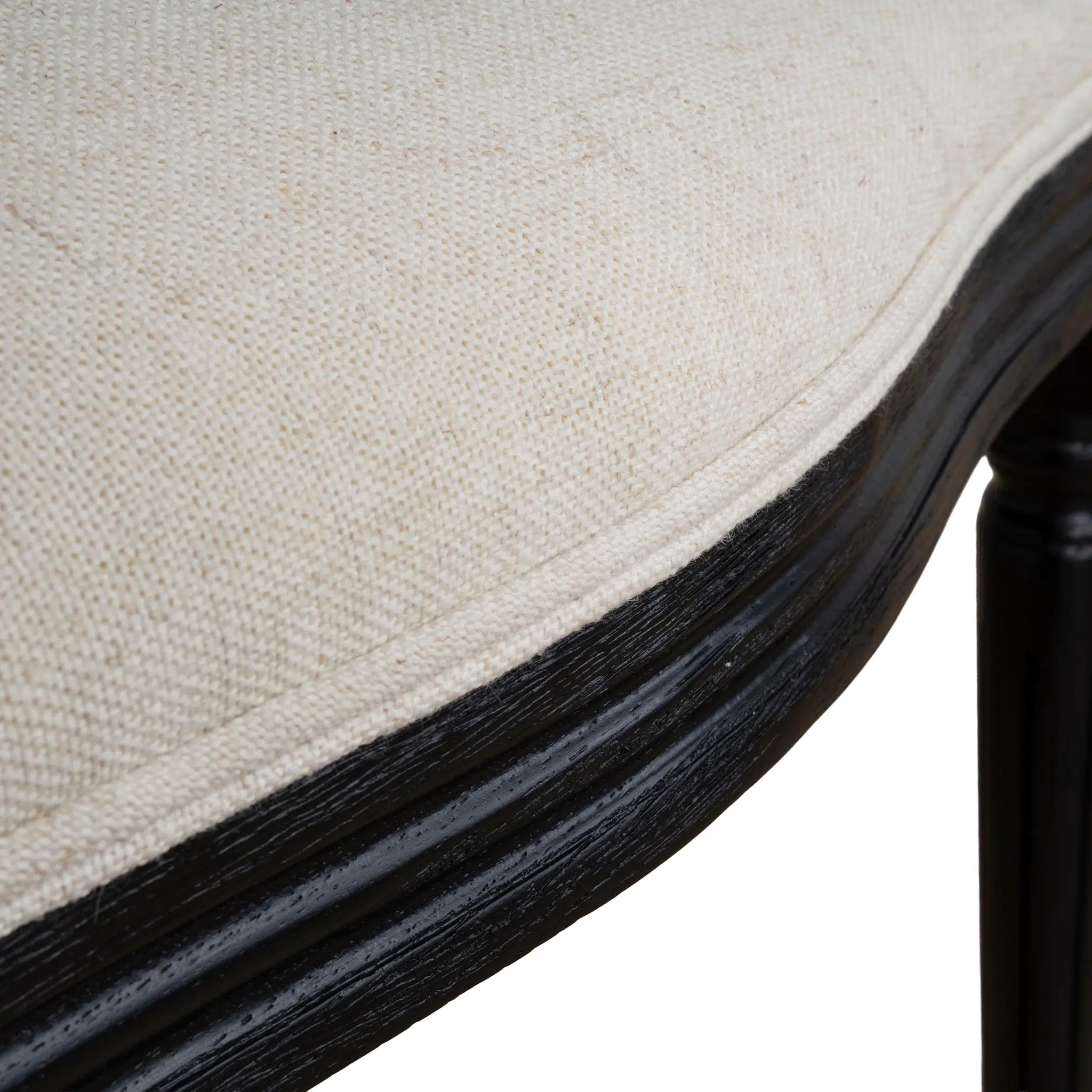 Crafted with 90% polyester and 10% linen blend fabric, the upholstery offers durable yet breathable comfort resistant to everyday wear. The solid elm frame is precision-machined and finished in a smooth matte black coating for lasting structural integrity.