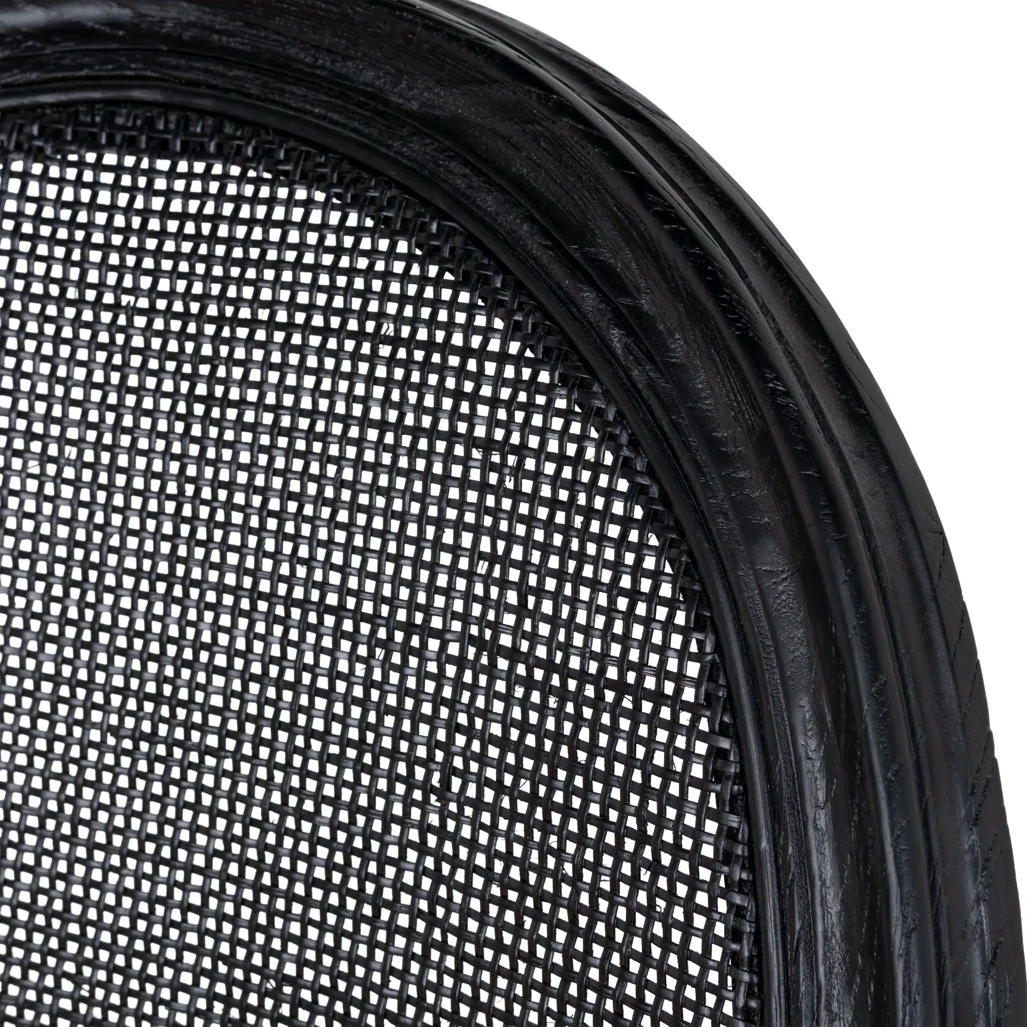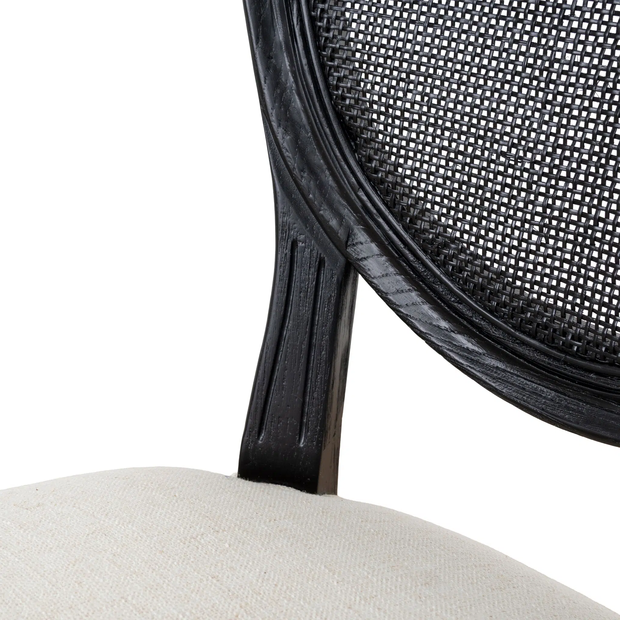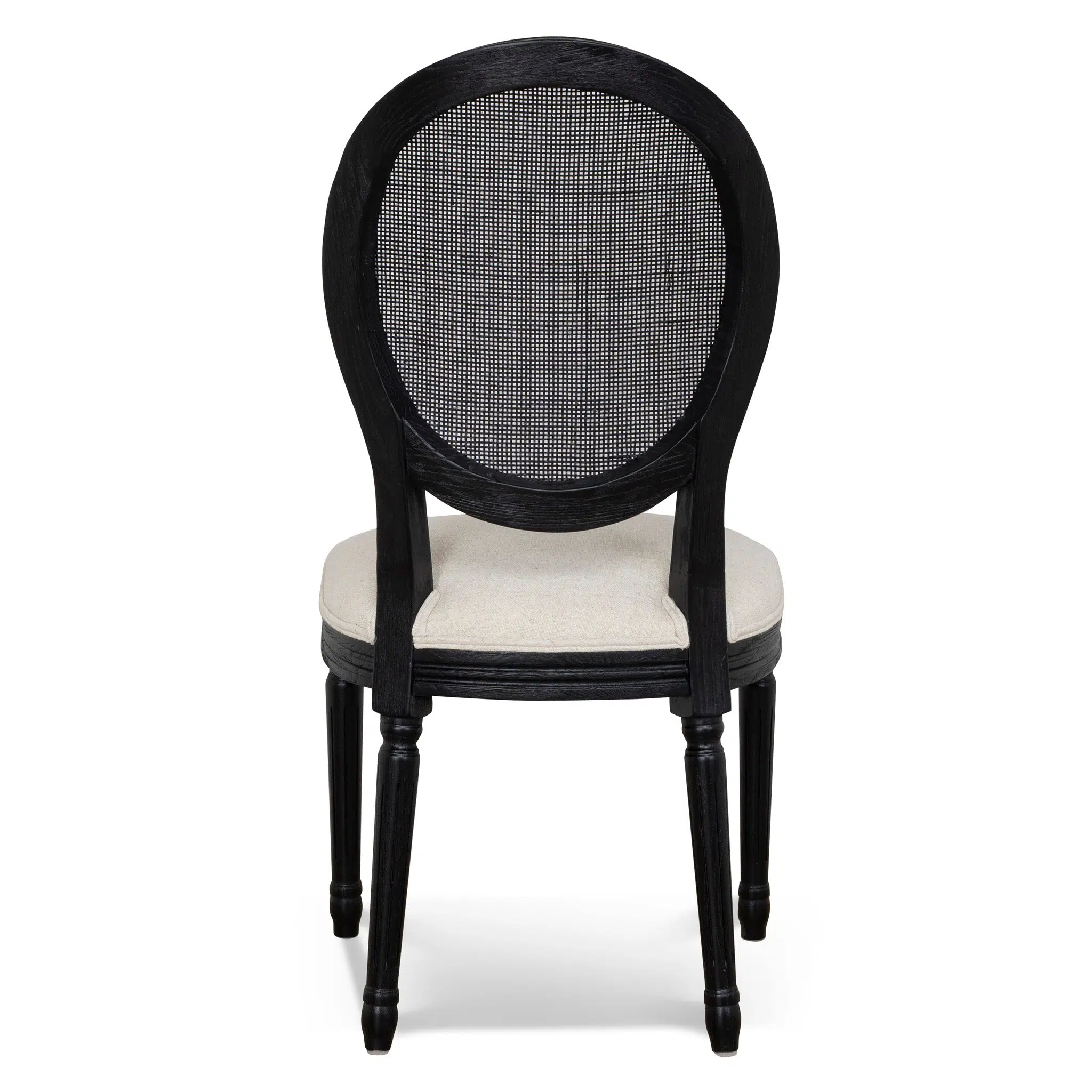 This black elm dining chair combines a refined dawn beige upholstery with sleek matte black elm frames, creating a harmonious balance between warmth and modern minimalism. The curved oval backrest and gently tapered legs add sculptural elegance while maintaining functional proportions.