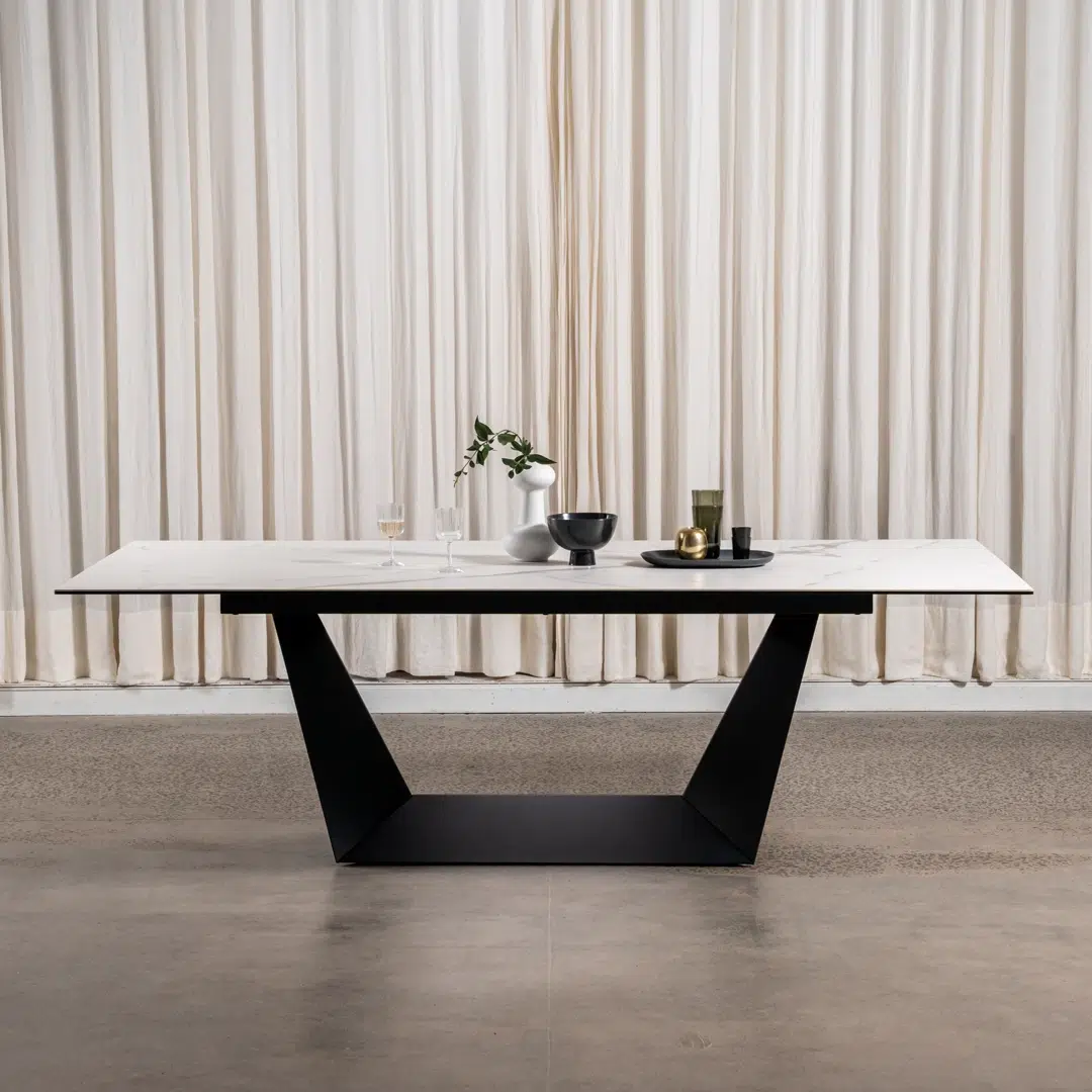 This ceramic dining table combines sophisticated aesthetics with practical functionality, serving as a striking centerpiece for contemporary dining spaces. Its premium matte ceramic surface features a luxurious marble-effect finish on tempered glass, blending opulent visual appeal with enduring durability. The sleek black powder-coated metal frame complements the tabletop’s clean lines, creating a cohesive modern look that adapts seamlessly to both formal dining rooms and casual living areas.