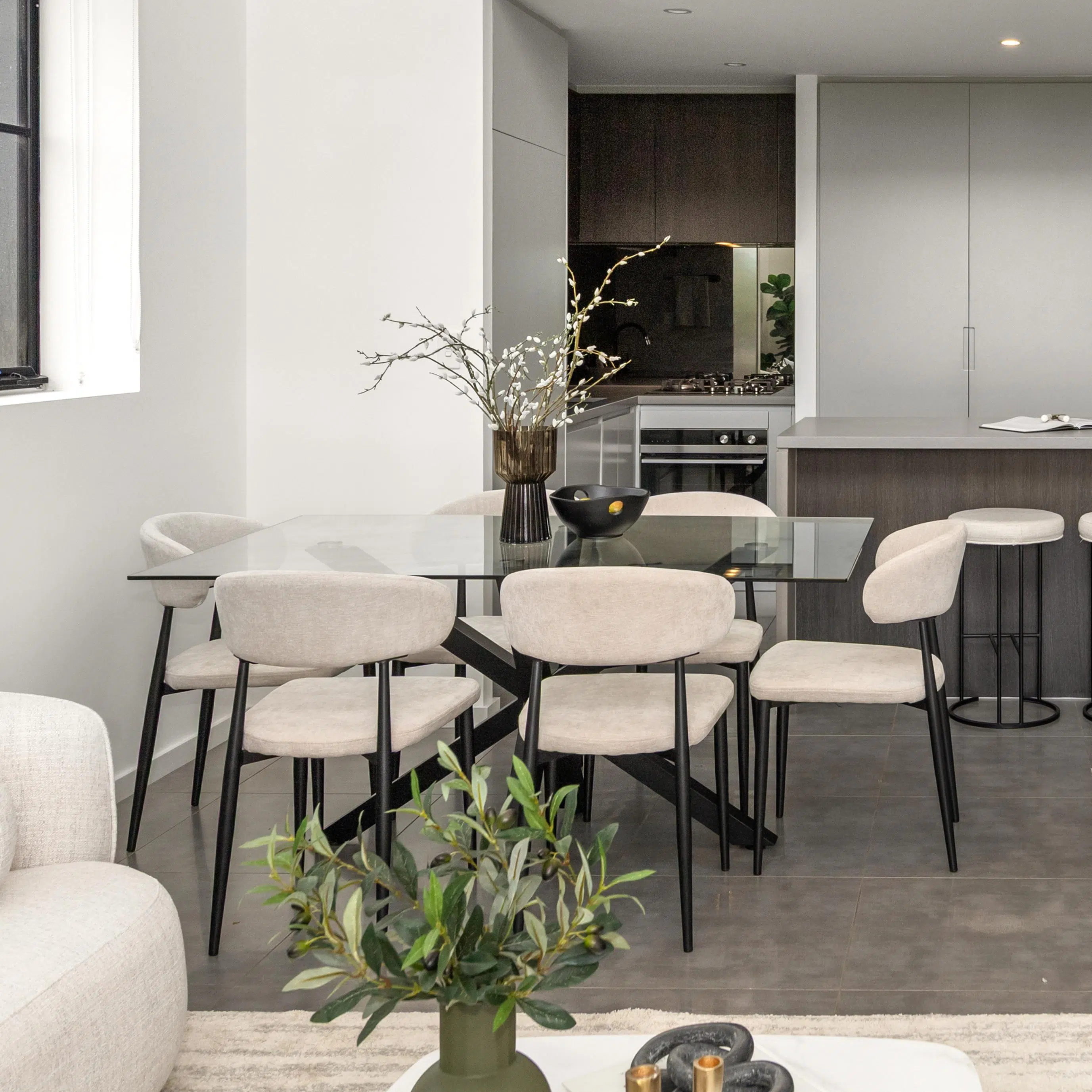 The Theo Dining Chair features a sturdy metal frame paired with soft fabric upholstery, creating a harmonious blend of durability and everyday comfort.