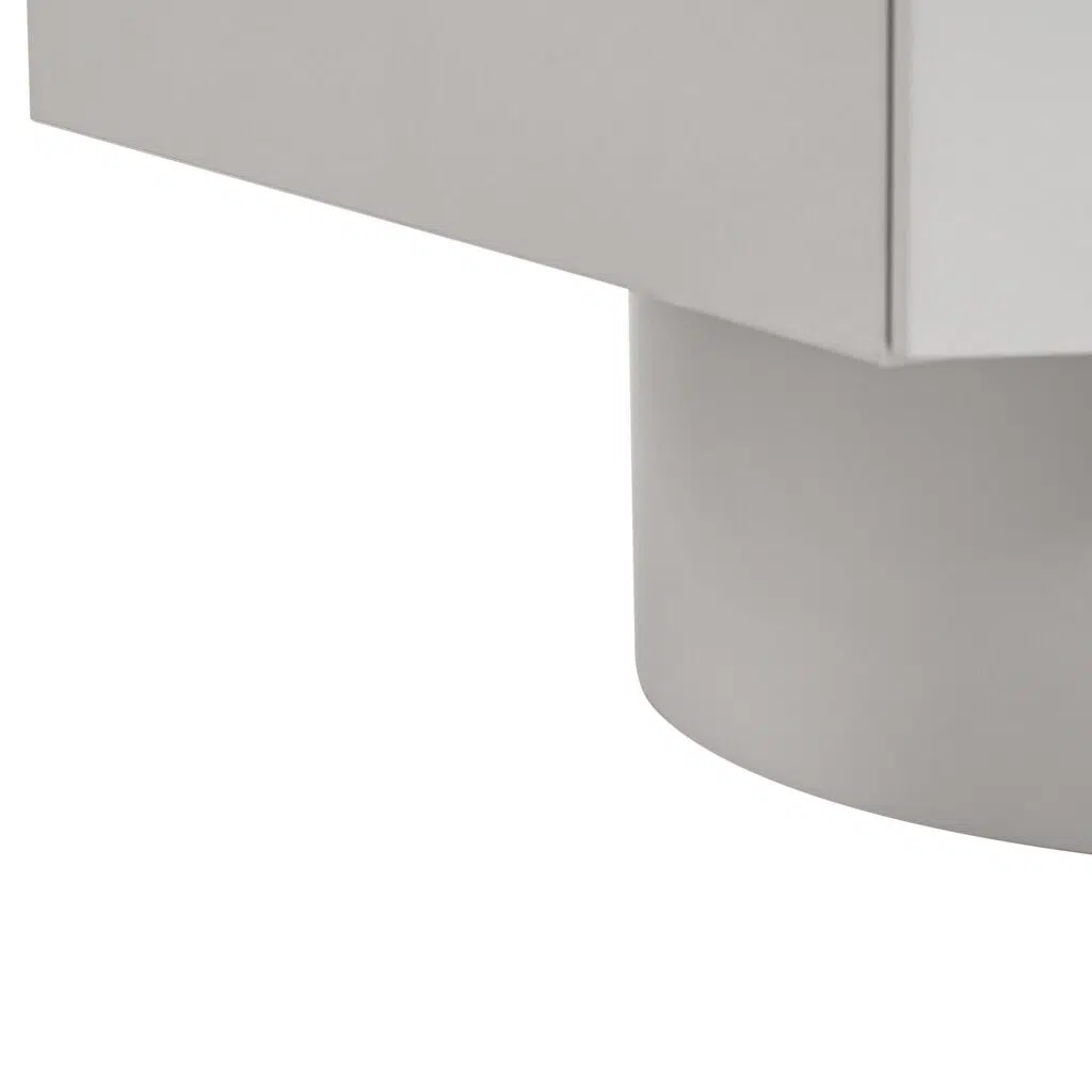 This bedside table combines contemporary form with functional elegance through its sculptural silhouette. The warm grey finish with PU coating creates a sophisticated base for the gracefully curved drawer fronts and bold cylindrical pedestal base, offering a seamless blend of architectural inspiration and intimate scale that enhances modern bedroom spaces.