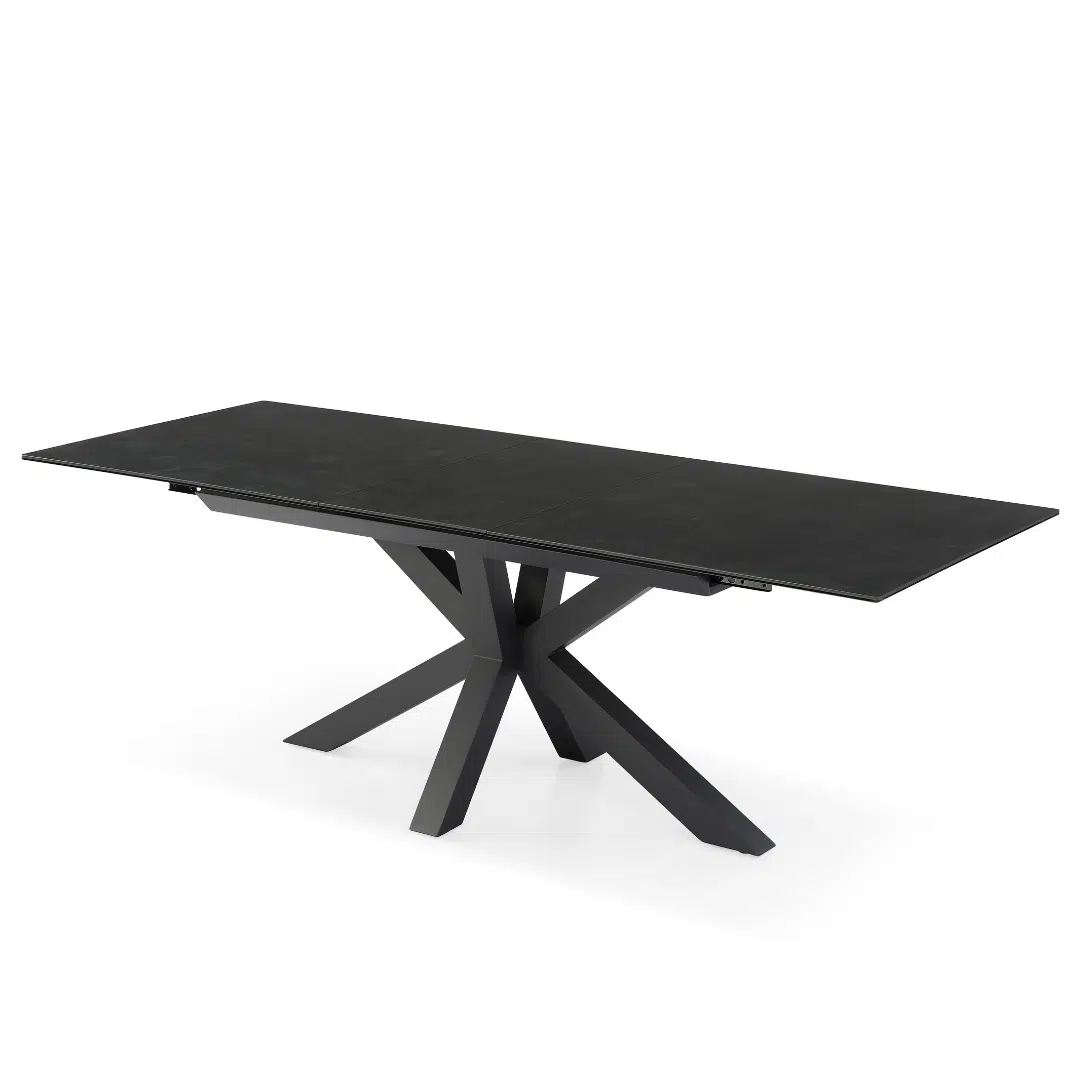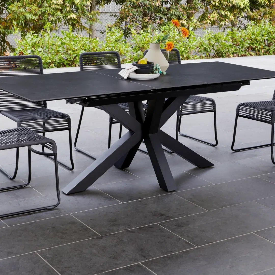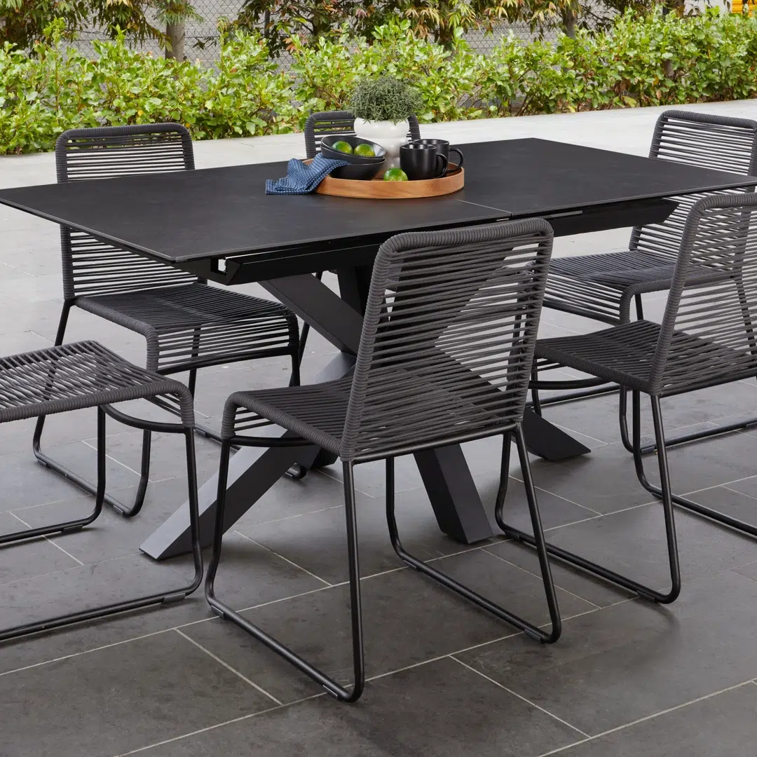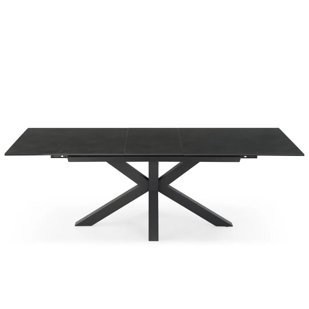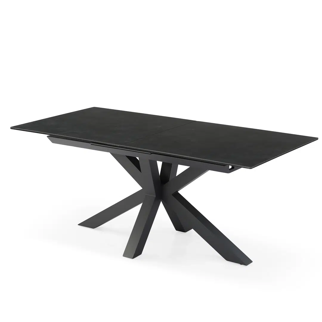 Crafted with a robust black powder-coated steel frame and topped with 6mm matte ceramic stone-effect tempered glass, this table combines resilience with modern sophistication. The scratch-resistant surface withstands daily wear while maintaining a sleek appearance, and the rust-resistant frame ensures stability in both indoor and outdoor environments.