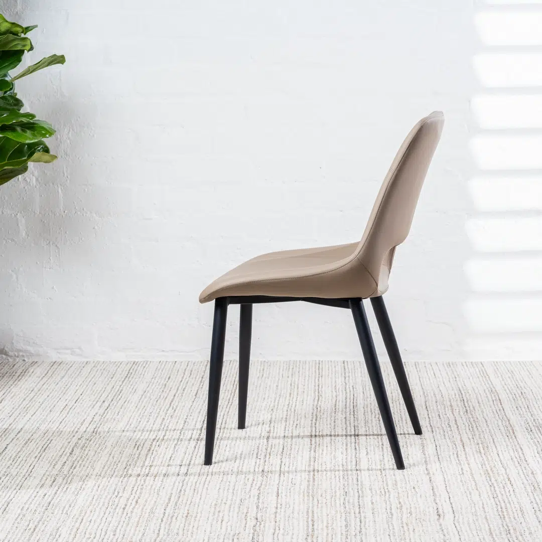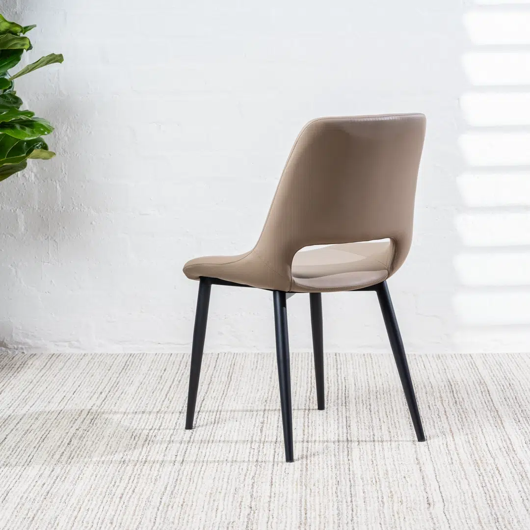 This dining chair combines sumptuous taupe and rich black eco-leather upholstery to create a layered, high-end aesthetic that adds sophistication to any dining area. The textured materials offer a tactile contrast while maintaining ethical sourcing, making it ideal for modern homes that value both style and sustainability.