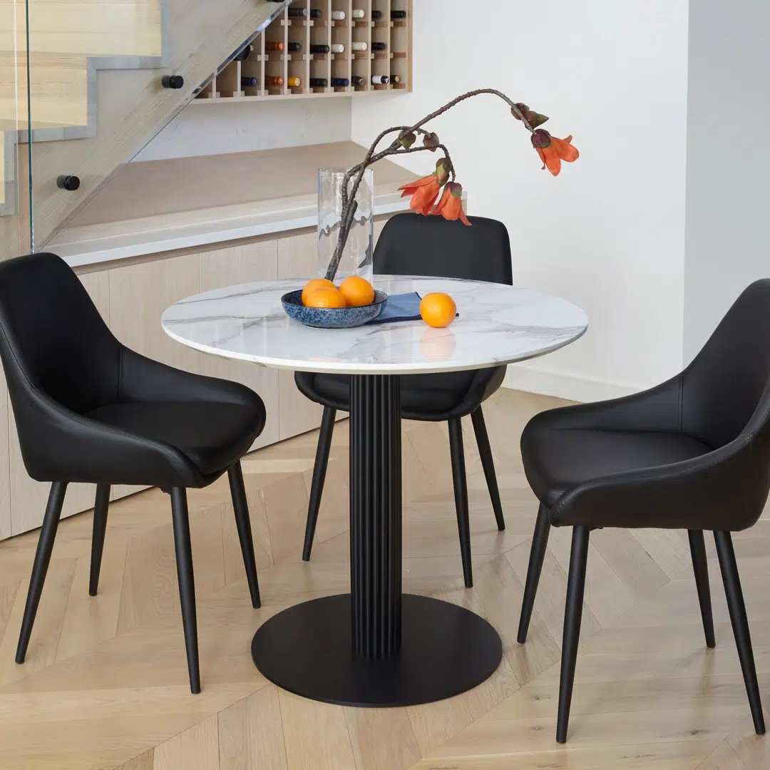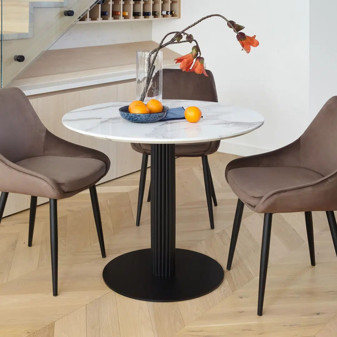 Measuring 90cm (35.4″) in diameter, the round tabletop provides ample space for daily meals, family gatherings, or displaying decorative centerpieces. The non-porous surface resists stains and moisture, requiring only a dry cloth for regular cleaning to maintain its polished appearance.