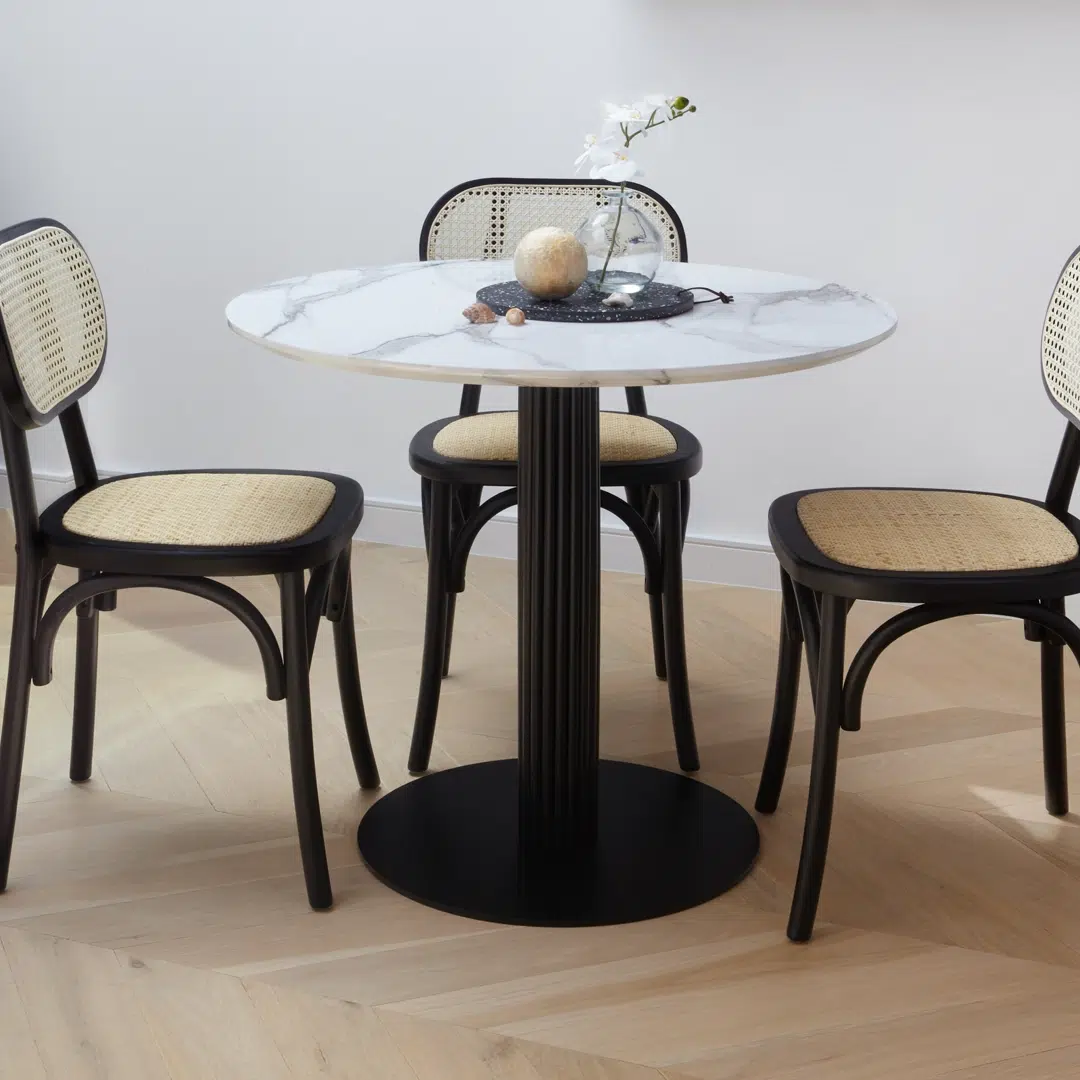 The streamlined “tube” column design and 75cm (29.5″) height make this table ideal for small apartments, dining nooks, or open-concept living areas. Its space-saving profile maintains visual openness while providing a practical surface for meals, work, or socializing.