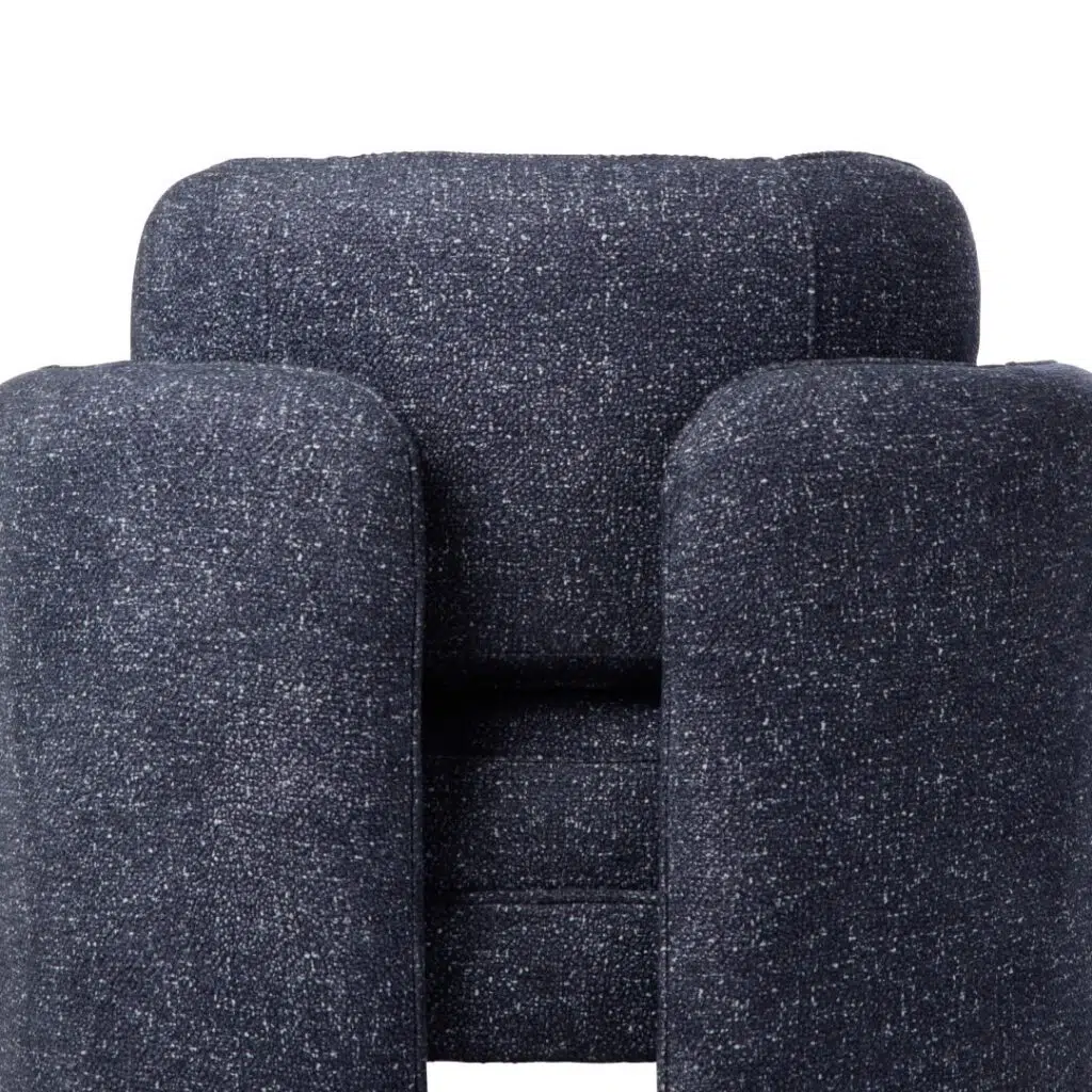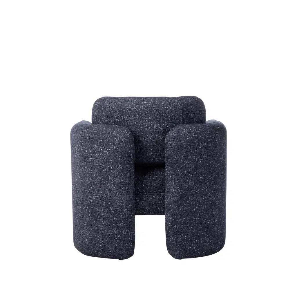 The chair’s legs extend upward to double as armrests, creating a uniquely snug and enveloping seating experience. This clever design not only enhances comfort but also gives the piece a sleek, uninterrupted profile that feels both modern and timeless.