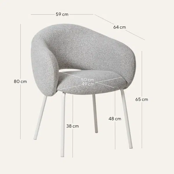 Measuring 59cm wide x 80cm high, the chairs fit seamlessly into standard dining setups. The 49cm-wide seat and 38cm leg height provide ample legroom beneath tables, and the 65cm arm height complements most table designs. Their compact footprint suits urban apartments or spacious dining rooms alike.