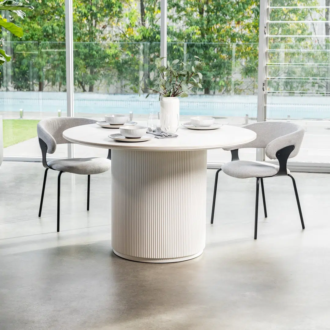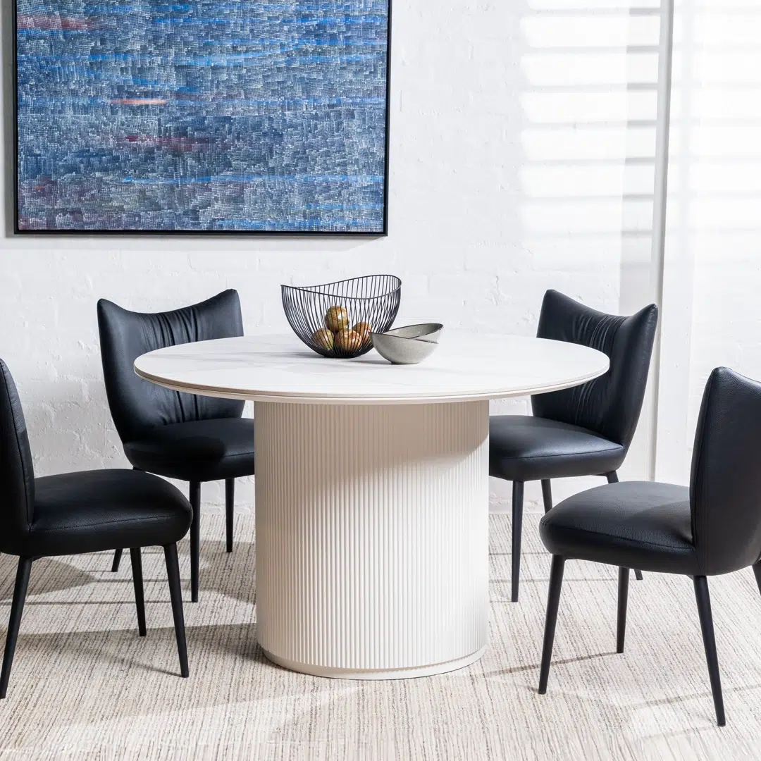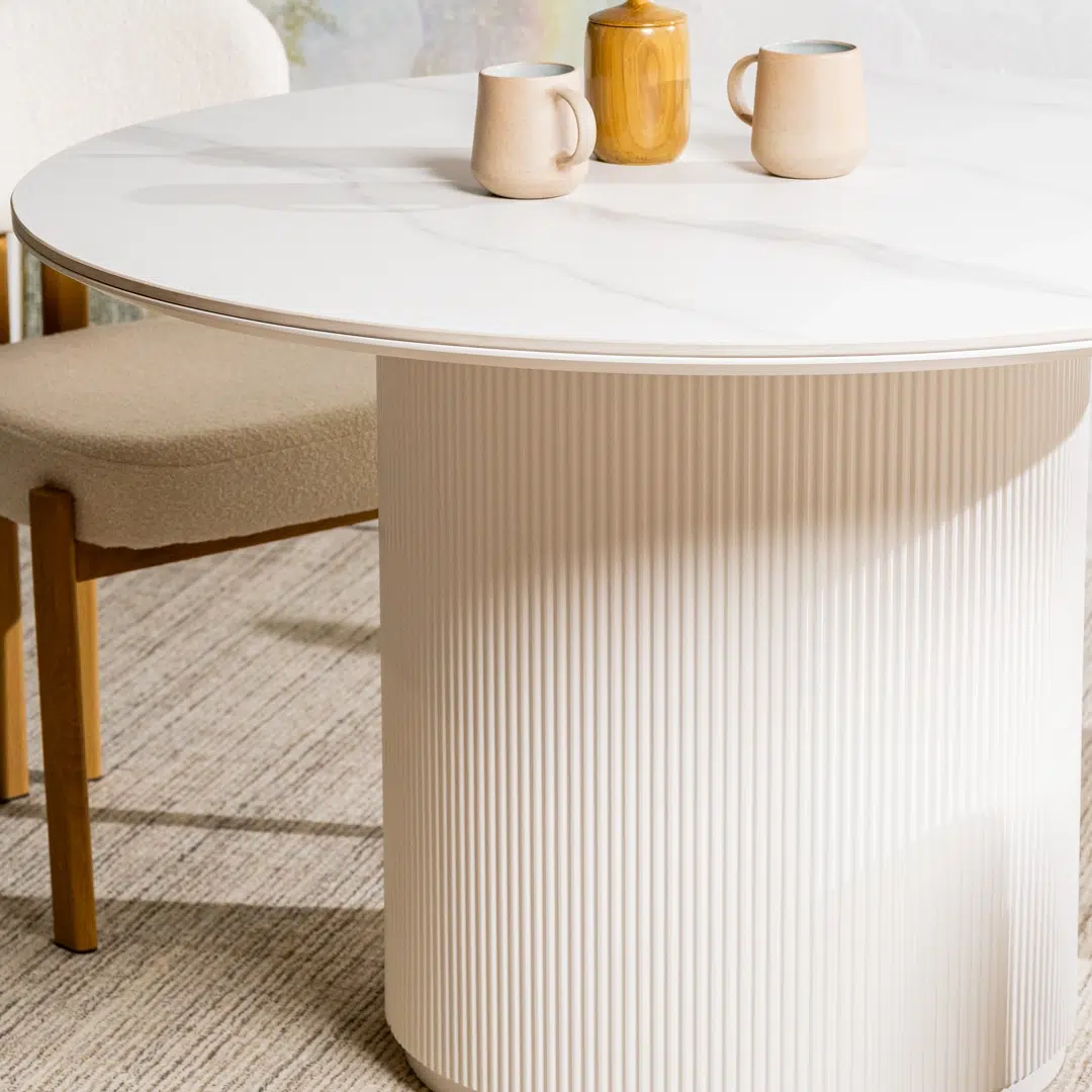 The Windsor table combines architectural flair with functional sophistication, distinguished by its signature ribbed column that commands attention in any dining room. This sculptural centerpiece features a matte ceramic tabletop with a marble-effect finish on MDF, creating a luxurious aesthetic that transitions seamlessly from casual meals to elegant entertaining. The white painted corrugated MDF frame complements the textured surface, blending modern artistry with classic dining traditions.