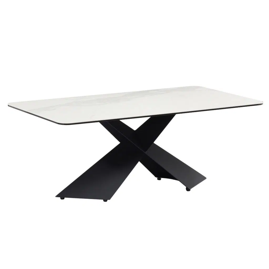This modern coffee table combines a black powder-coated steel frame with a 3mm ceramic surface fused to tempered glass, creating a striking fusion of durability and sophistication. The frame’s corrosion-resistant finish ensures long-lasting structural integrity, while the seamless integration of materials highlights precision engineering in every detail.